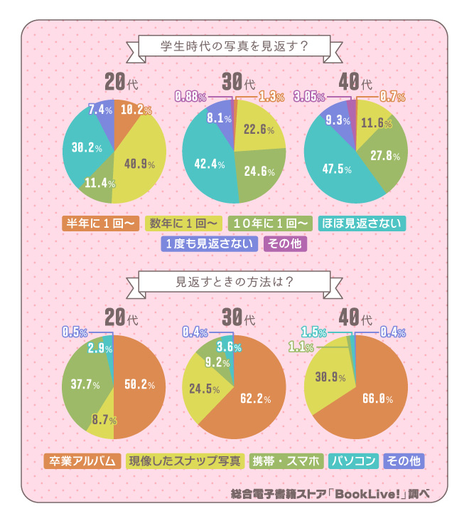 そして見返す方法は、各世代で「卒業アルバム」が多数ではあるものの、「現像したスナップ写真」から「携帯・スマホ」で手軽に見る時代へと変遷していきます。