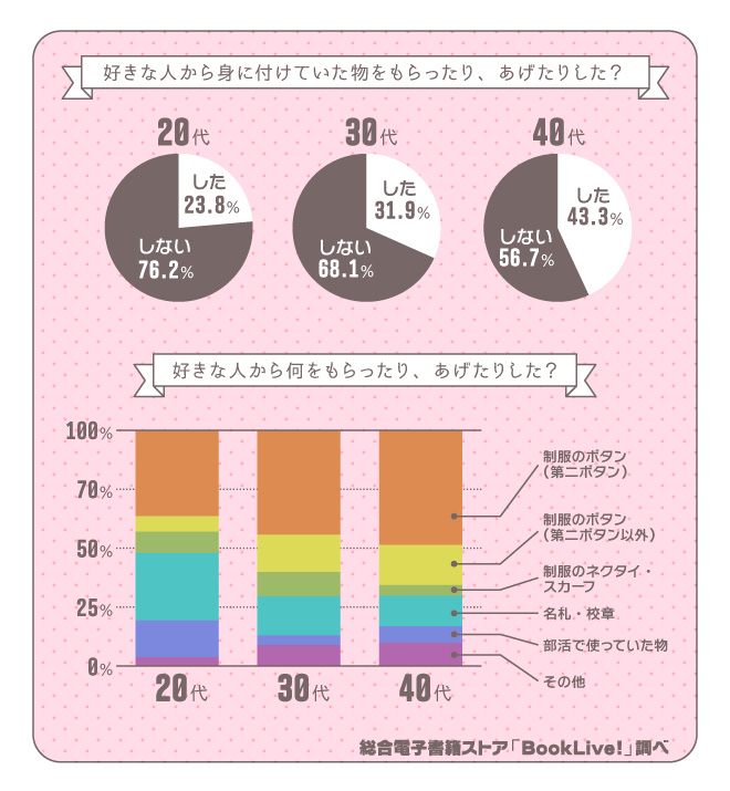 また、もらった物・あげた物は、40代では制服のボタンが6割以上を占めたのに対し、20代では約4割に。