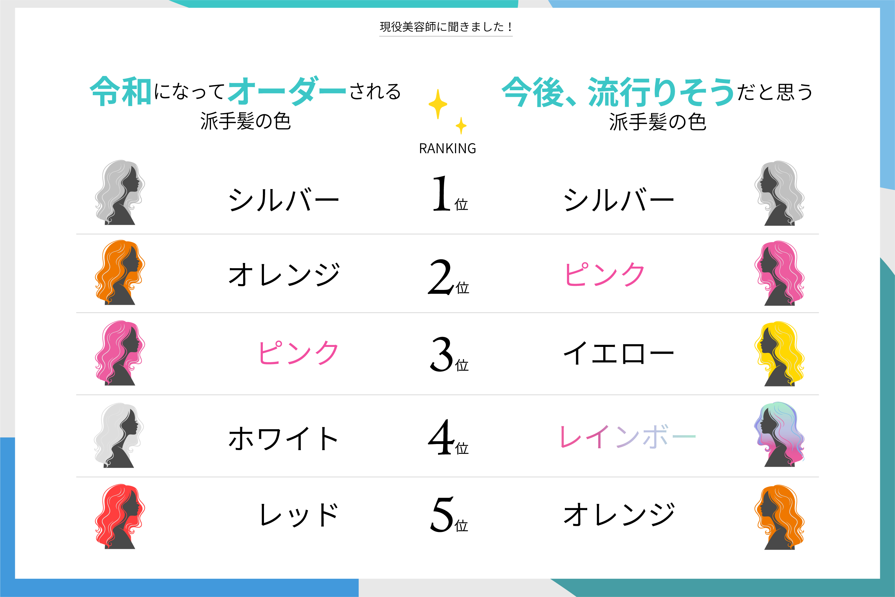 また、現役美容師が予想する今後流行りそうな髪色ランキングの第1位は「シルバー」で、第4位には昨年から話題の「レインボーカラー」がランクインしました。