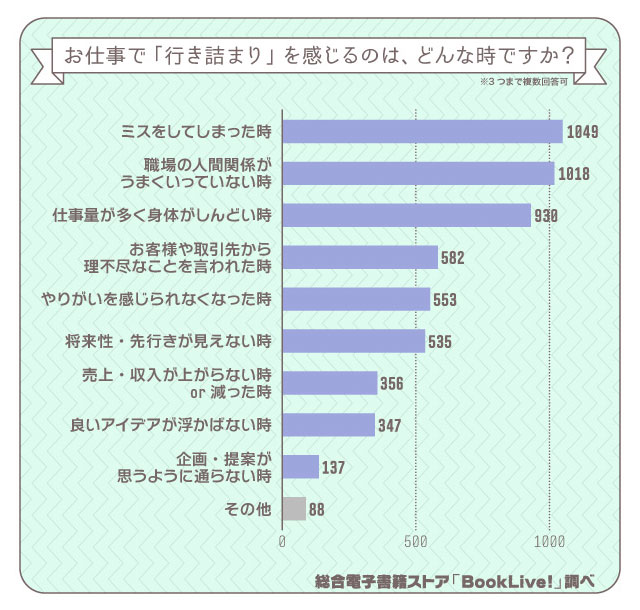 仕事で「行き詰まり」を感じるときの状況は、「ミスをしてしまったとき」「職場の人間関係が上手くいっていないとき」「仕事量が多くて身体がしんどいとき」の3回答が上位を占めました。