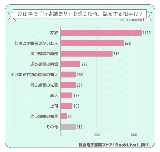 仕事で「行き詰まり」を感じたときは誰に話す?という質問には、「家族」「仕事とは関係のない友人」「同じ部署の同僚」が上位を占めました。