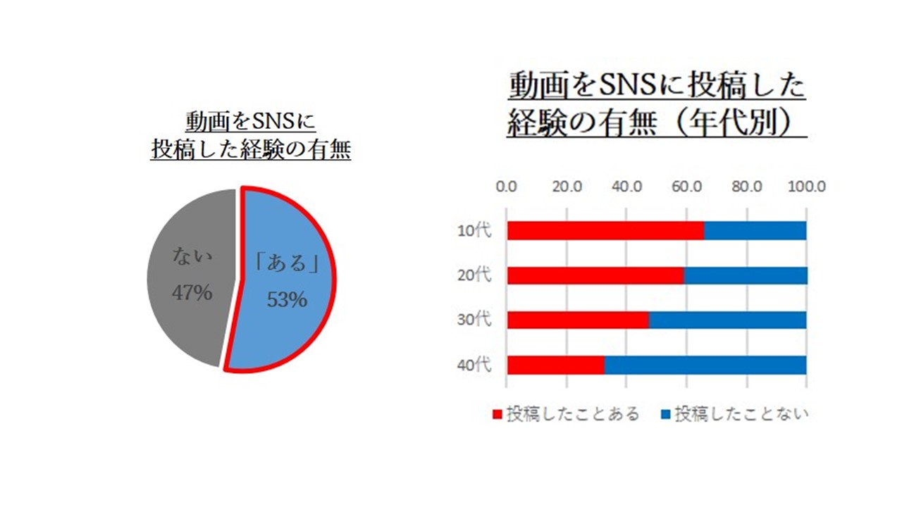 自信で撮った動画をSNSに「投稿したことがある」人の割合も、年代が下がるにつれ高い回答となりました。さらに、全体でも半数以上の53%が投稿経験者という結果も。