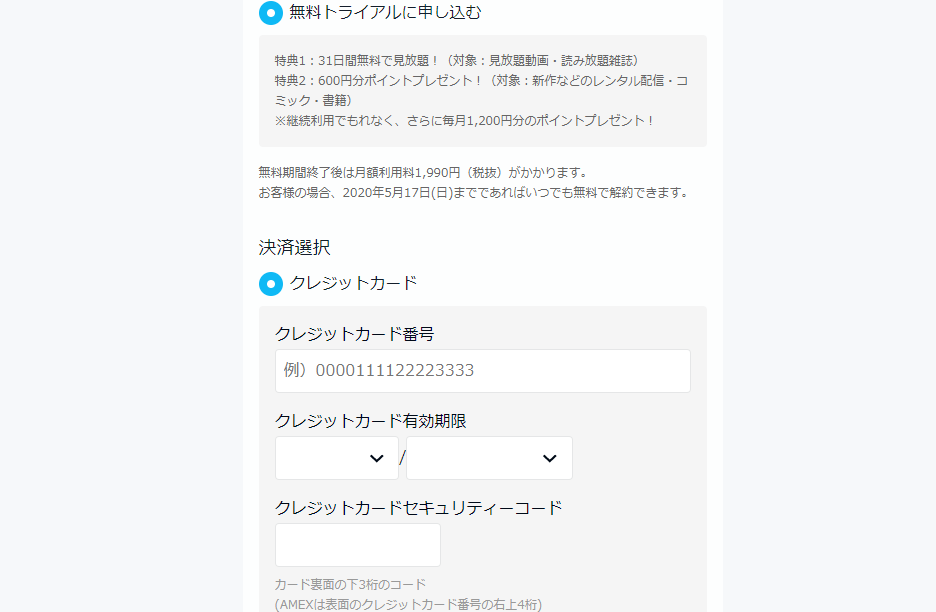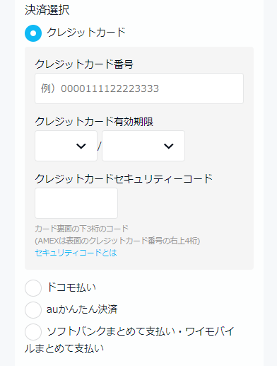 クレジットカード決済か、ドコモ・au・ソフトバンク・ワイモバイルのキャリア決済かを選択します。必要な事項を選択・記入し、登録したメールアドレスに送られてきたメールを確認して登録完了です。