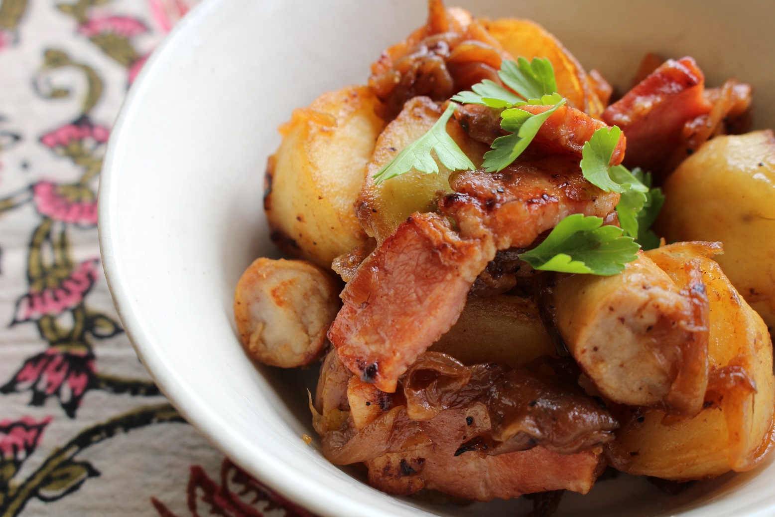 厚切りベーコンとソーセージ、じゃがいものソテーリヨン風