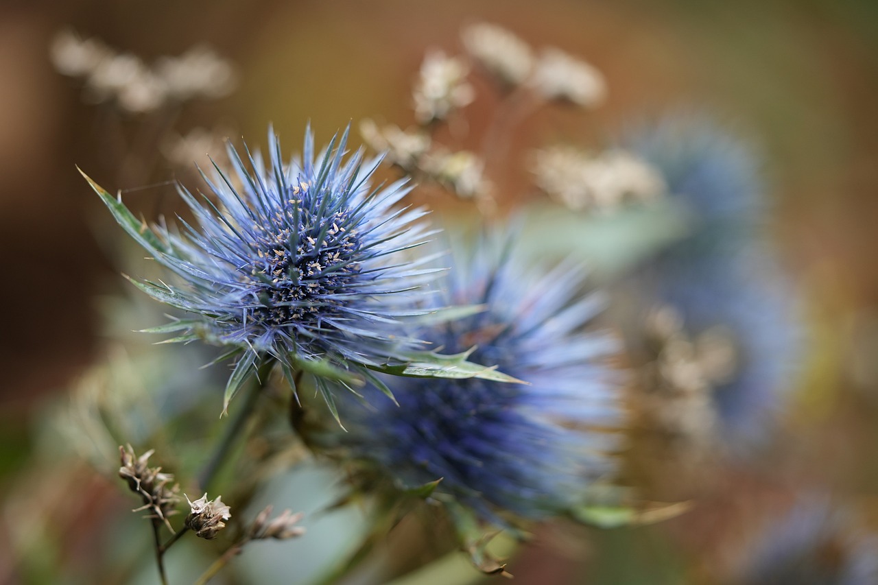 エリンジウムは、地中海原産の草花。いくつかの品種があり、小さな花が球状に集まって、ポンポンのような形になります。葉っぱやガクにはトゲがあり、主にブルーやシルバーの花を咲かせます。