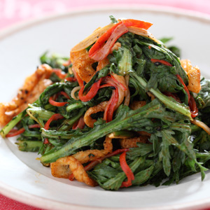 3.フライパンに、ごま油(小さじ2)を熱し、油揚げをカリカリに焼き、春菊の茎を加えていため、塩、こしょうをする。
