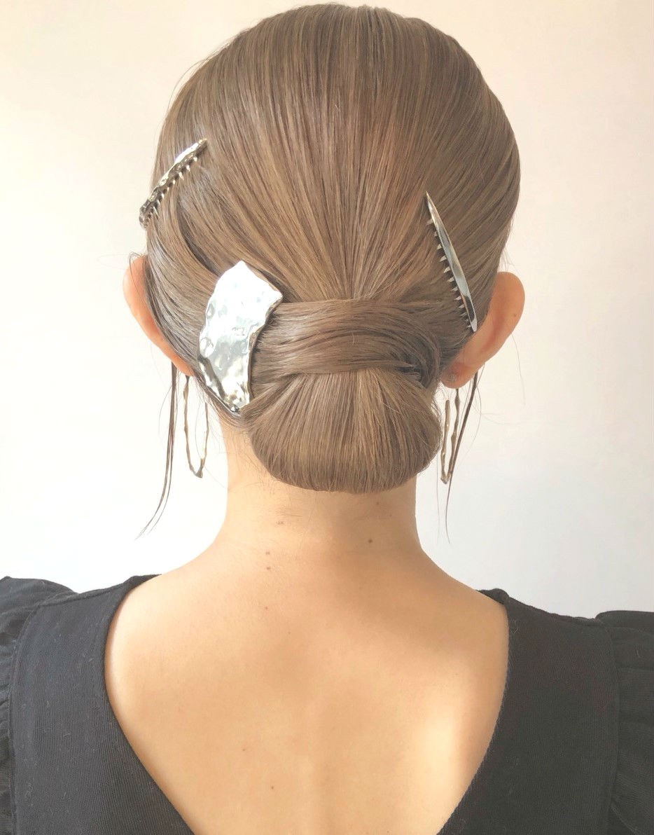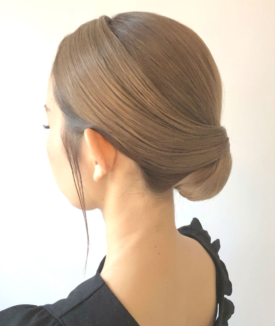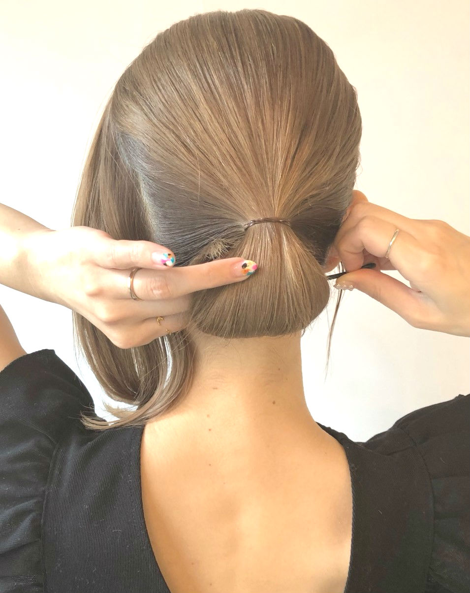 ④②で残しておいたサイドの髪の毛でゴムを隠すように結び目に巻き付けて、ピンで固定する