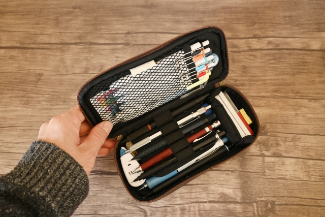 またフタの裏にはメッシュのポケットが付いていますので、ここに付箋やシャーペンの芯などを入れてケースの中をすっきり整理することもできますよ。