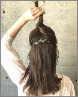 STEP2 耳の後ろからギザギザの分け目をつくり、上の方の毛束をねじる