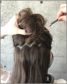 STEP5 ピン2本をクロスして留め固定する。毛先はSTEP3に巻き付けピンで留める。