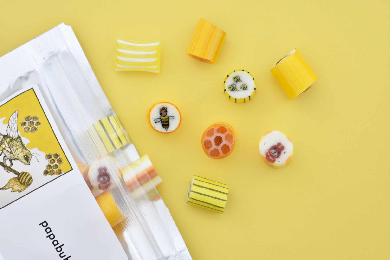 「世界一おもしろいお菓子屋さん」PAPABUBBLE(パパブブレ)の口に入れてすぐ溶ける食べやすいサイズの金太郎飴です♪ミツバチの可愛いイラストが描いてあるので食べるたびに可愛さで気分UPして癒されてみてはいかがでしょうか?