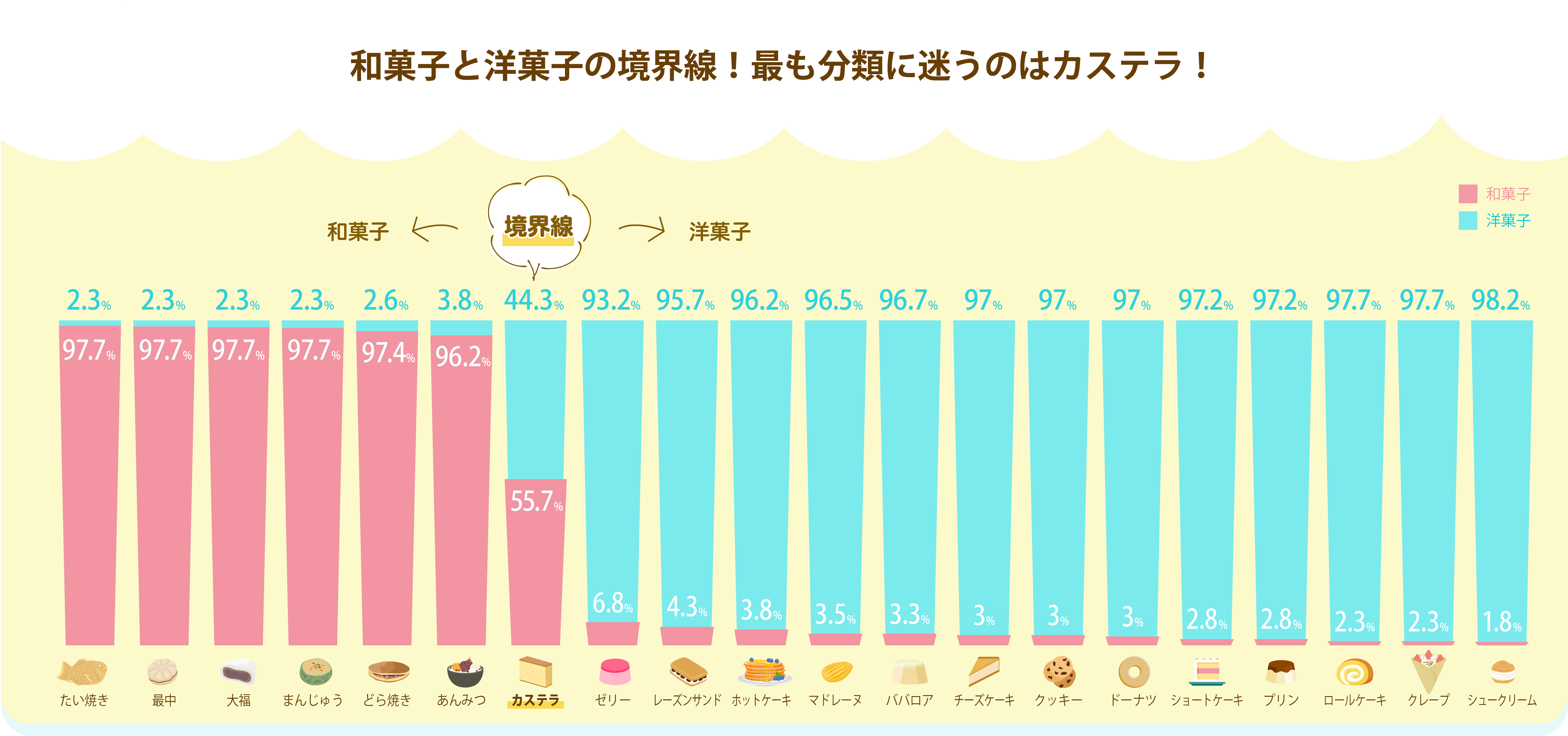 唯一、「カステラ」は和菓子と答えた人が55%、洋菓子と答えた人が44%という結果で、迷う人が多いことが明らかになりました。和菓子と洋菓子の境界線は「カステラ」だと言えそうです。