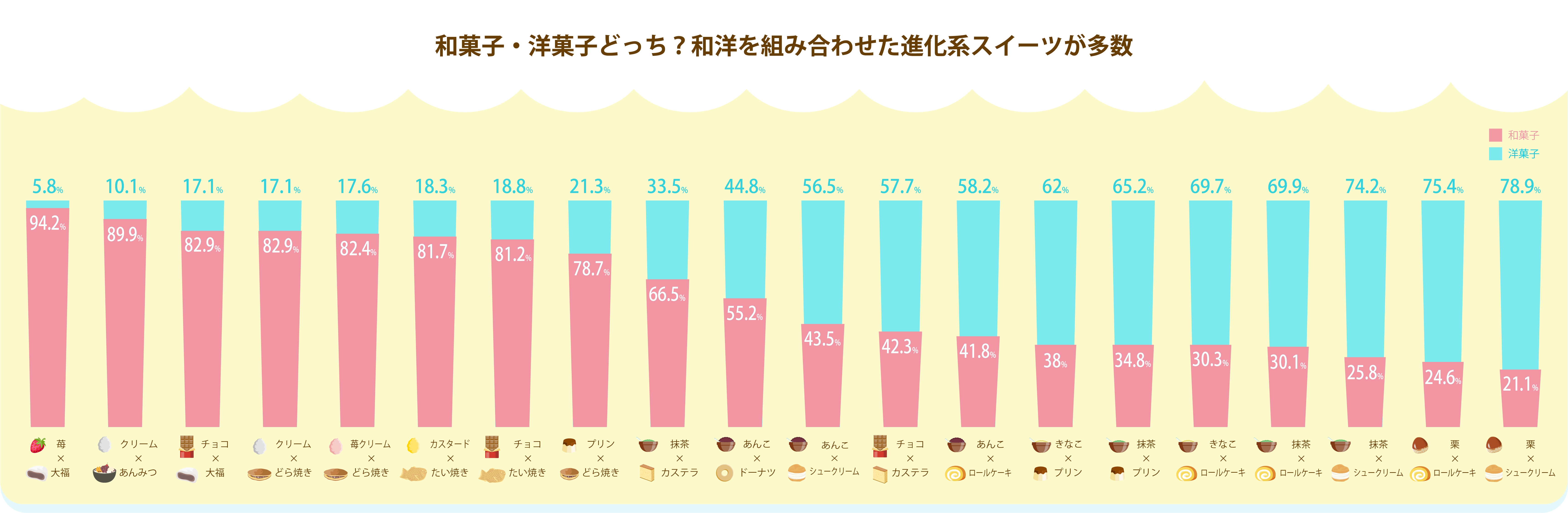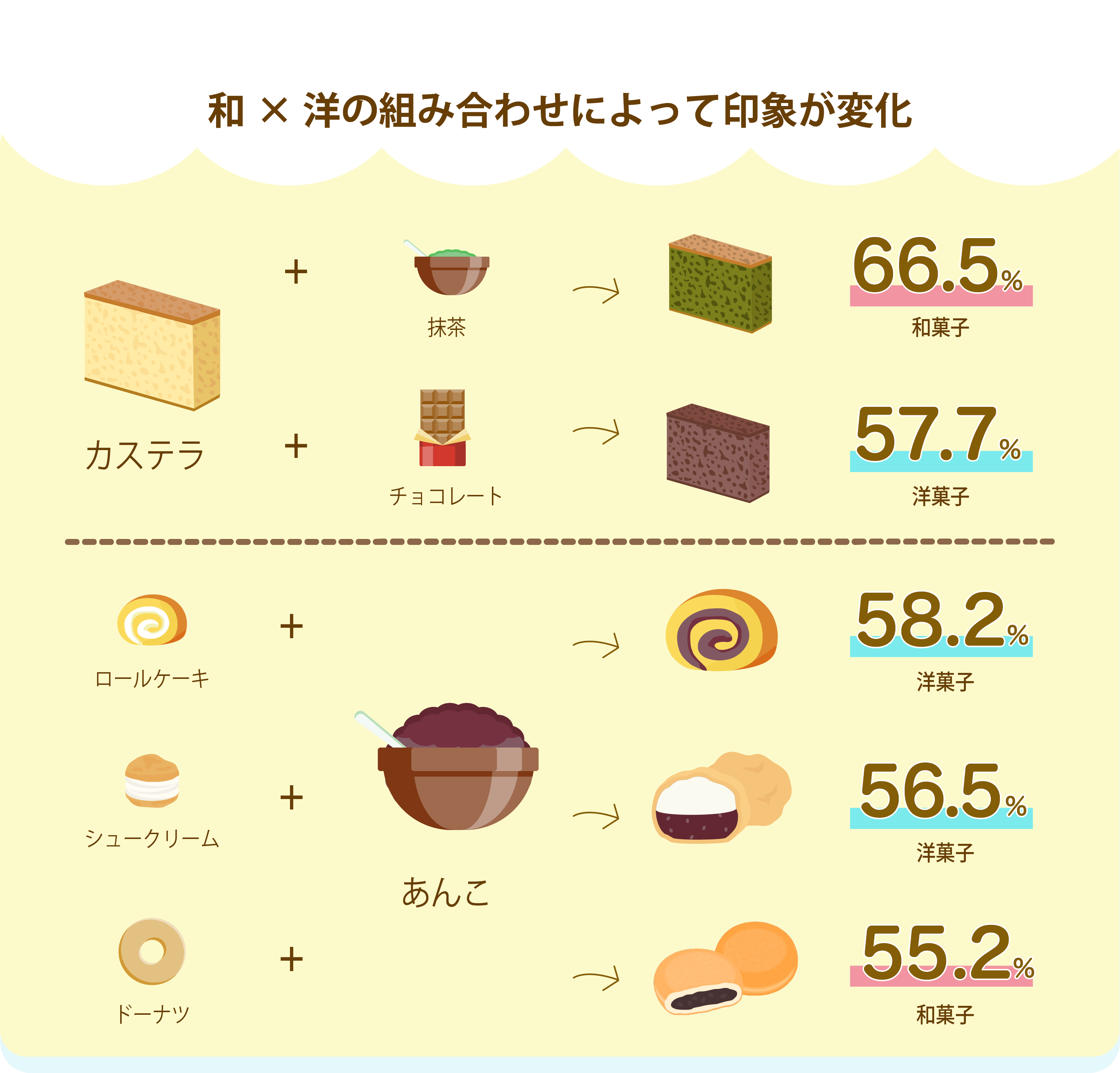 また、組み合わせる素材については、洋の要素よりも和の要素に左右されやすいことが判明し、さらには抹茶、きなこ、栗と比べて特にあんこを和と認識する人が多いという結果になりました。