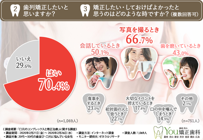 20~30代の女性約1,000名を対象に「口元のコンプレックスと矯正治療」に関する調査を実施したところ、「歯列矯正したい」と回答した人は7割以上いることがわかりました。