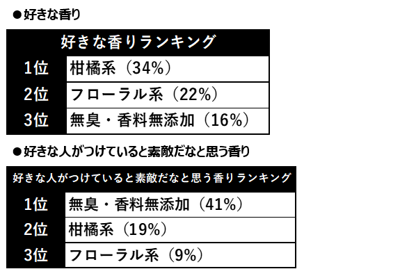 また、好きな人がつけていたら嬉しい香りでも半数以上が、無臭・香料無添加、柑橘系などの甘すぎない香りを好む傾向に。