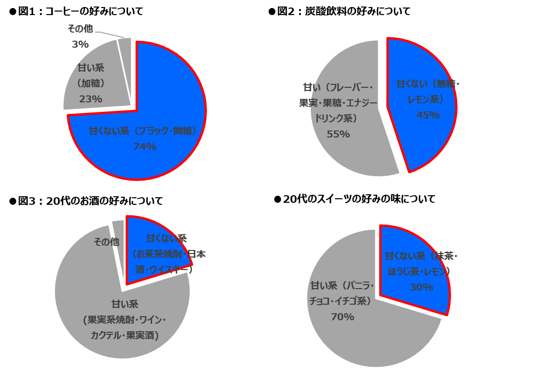 コーヒーの好みではブラック・微糖派がなんと半数以上。炭酸飲料では約4割もの人が無糖やレモン系のさっぱりとしたものを好んでいます。