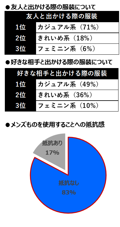 また、メンズアイテムをファッションに取り入れることに抵抗がない人が83%。令和のファッションは、男女の境目は薄く、「良い」と思ったものは取り入れ自分らしく快適に過ごすためのユニセックスファッションがトレンド傾向にあるようです。