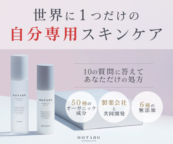 「HOTARU」はオンライン上で10つの質問による約110,000通りの肌診断結果から世界に1つだけのスキンケアを処方してくれるサービスです。50種類のオーガニック成分から、悩みに適した成分をパーソナライズ配合し、2つで4役の機能を持つローションとモイスチャライザーが届きます。