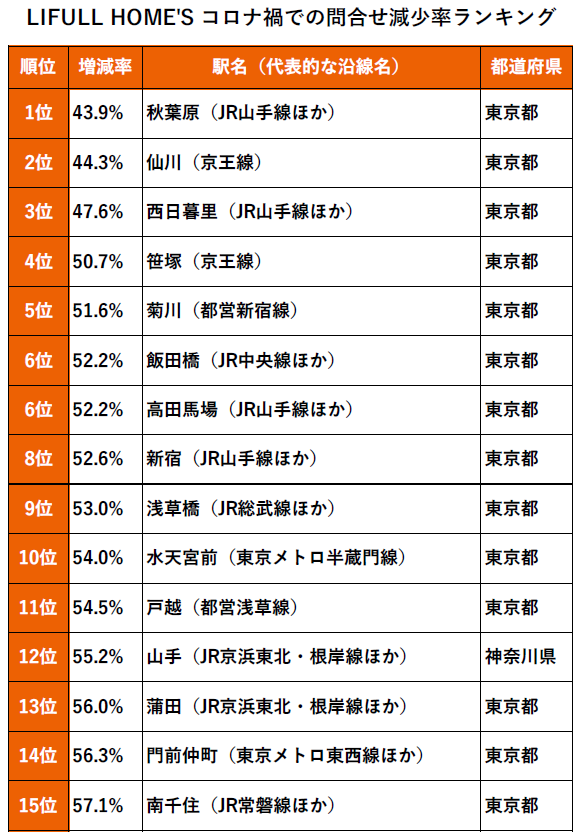 問合せ数の減少率ランキングでも変化をみせています。最も減少率が大きかった場所は「秋葉原」、次いで「仙川」「西日暮里」。都心への交通・生活利便性のバランスが評価されやすい街が、軒並み昨年の半分程度の問合せ数に激減する結果となりました。