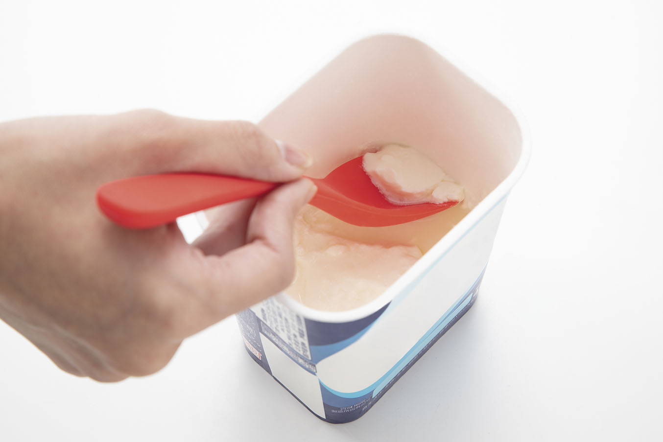 大容量カップのヨーグルトのスミや側面もきれいにすくえる一体型スプーン。ヨーグルト以外にも背の高い瓶やレトルト食品のパウチの中身を出す際にも重宝します。