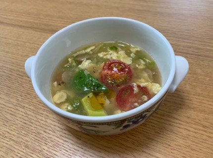 簡単に作れるレシピ「アボカドとミニトマトの卵スープ」