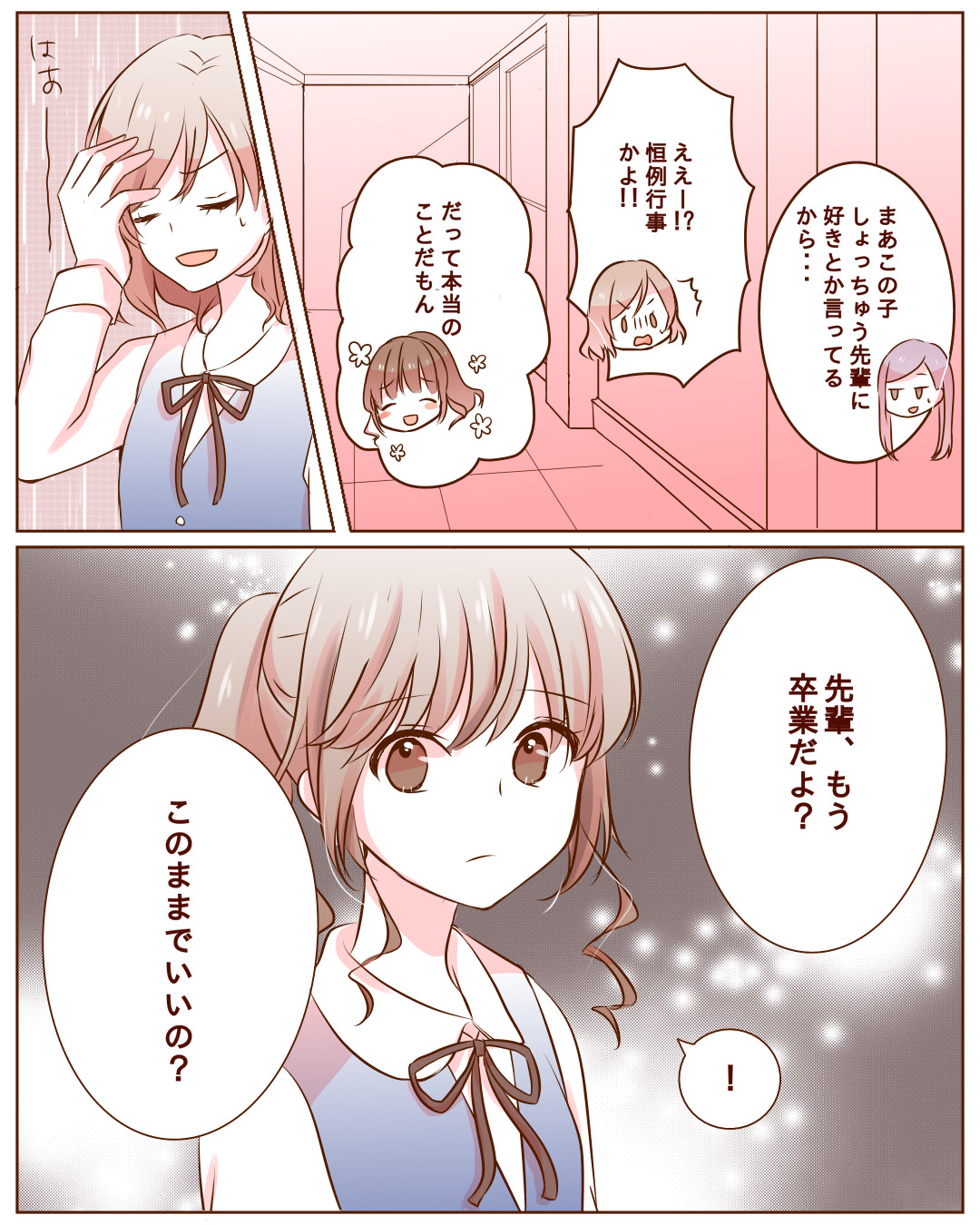 卒業式 全校生徒の前でサプライズ③【Lovely漫画】 オリジナル漫画 2023年12月12日 ▼前回のお話はこちら! 卒業式 全校生徒の前でサプライズ②【Lovely漫画】 | Lovely[ラブリー] ©りん/エピソード:こなつ 続きをお楽しみに♡ ▼これまでのお話はこちら! 卒業式 全校生徒の前でサプライズ①【Lovely漫画】 | Lovely[ラブリー] ©りん/エピソード:こなつ おすすめ青春漫画もチェック! 先生と叶わない恋【Lovely漫画】 | Lovely[ラブリー] 叶わない恋と気づきながらも、アプローチし続けた甘酸っぱい記憶。 ©いの/エピソード:ぱんさん キュンとする恋の思い出【Lovely漫画】 | Lovely[ラブリー] ©beth/エピソード:ルンルン 卒業シーズンに読みたい泣ける・切ない・グッとくる学園漫画ランキングTOP10! | Lovely[ラブリー] 20代・30代・40代に「卒業式にまつわる思い出」を大調査!それぞれの「アオハル」を紐解いたら、卒業アルバムや第二ボタン…といった思い出のアイテムに違いがあることがわかりました。卒業シーズンに読みたい漫画ランキングも発表します! ライター Lovely編集部 編集部レポや最新情報など皆さんの「知りたい」をお届け!よろしくお願いします♡ 目次Related article / 関連記事 オリジナル漫画 メンヘラ彼氏にサヨナラ【Lovely漫画】 ©みんみ 2022年3月29日 オリジナル漫画 年下イケメン彼氏に翻弄されるオンナの毎日#3【Lovely漫画】 ©みんみ 2022年3月29日 オリジナル漫画 2人暮らしのゆる家事日記~気まぐれ旦那の献立作りの巻き~後編【Lovely漫画】 ©みんみ 2022年3月29日 オリジナル漫画 年下イケメン彼氏に翻弄されるオンナの毎日#1【Lovely漫画】 ©みんみ「初めての○○の話 前編」 2022年3月29日 オリジナル漫画 年下イケメン彼氏に翻弄されるオンナの毎日#2【Lovely漫画】 ©みんみ「初めての○○の話 後編」 2022年3月29日 オリジナル漫画 よかったらシェアしてね! URLをコピーしました! URLをコピーしました! 超名作の少女漫画を読みたい!歴代人気の少女漫画50選【最新2023】 【悠】の意味・由来を知って名前に取り入れよう|子供の名づけをお助け!