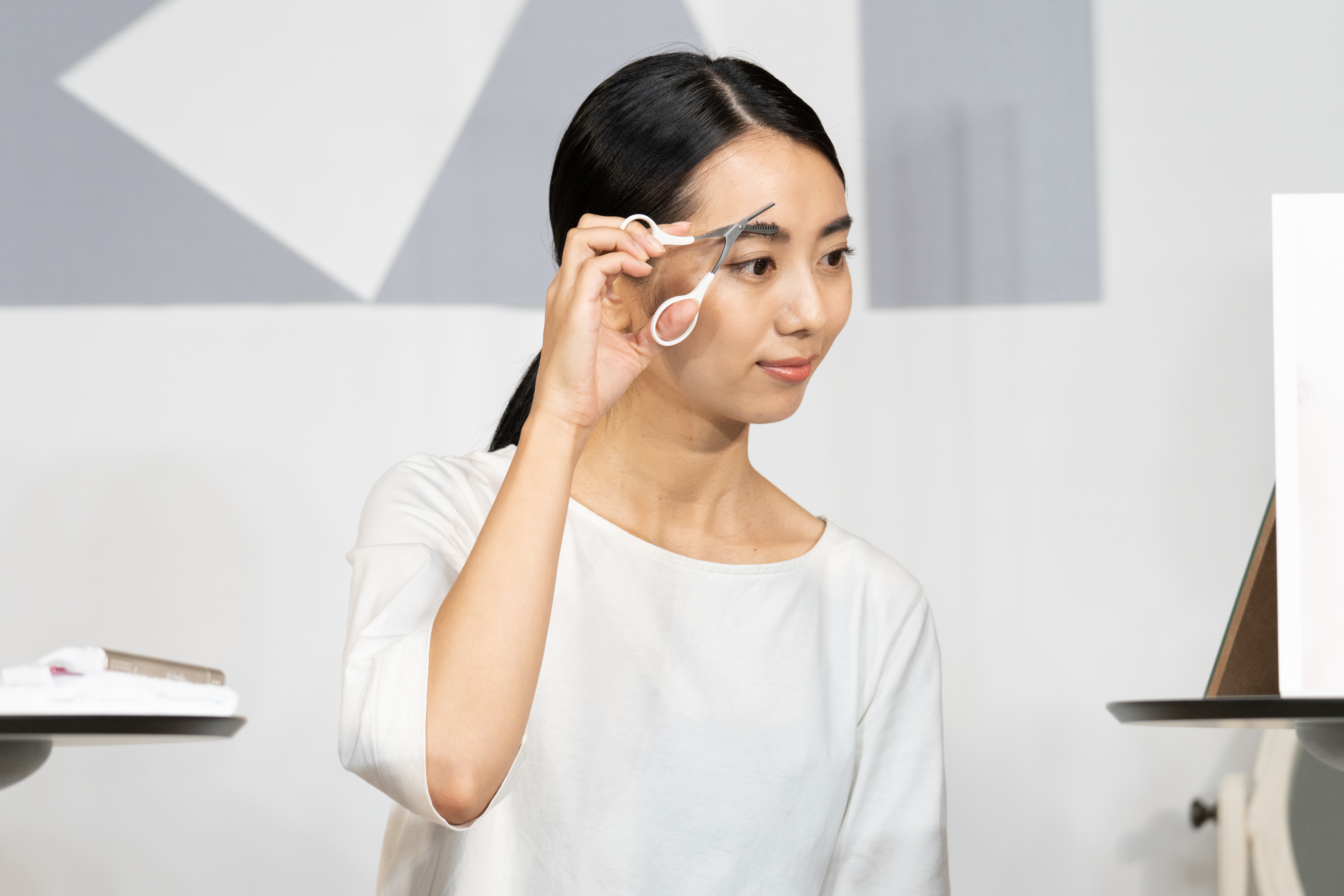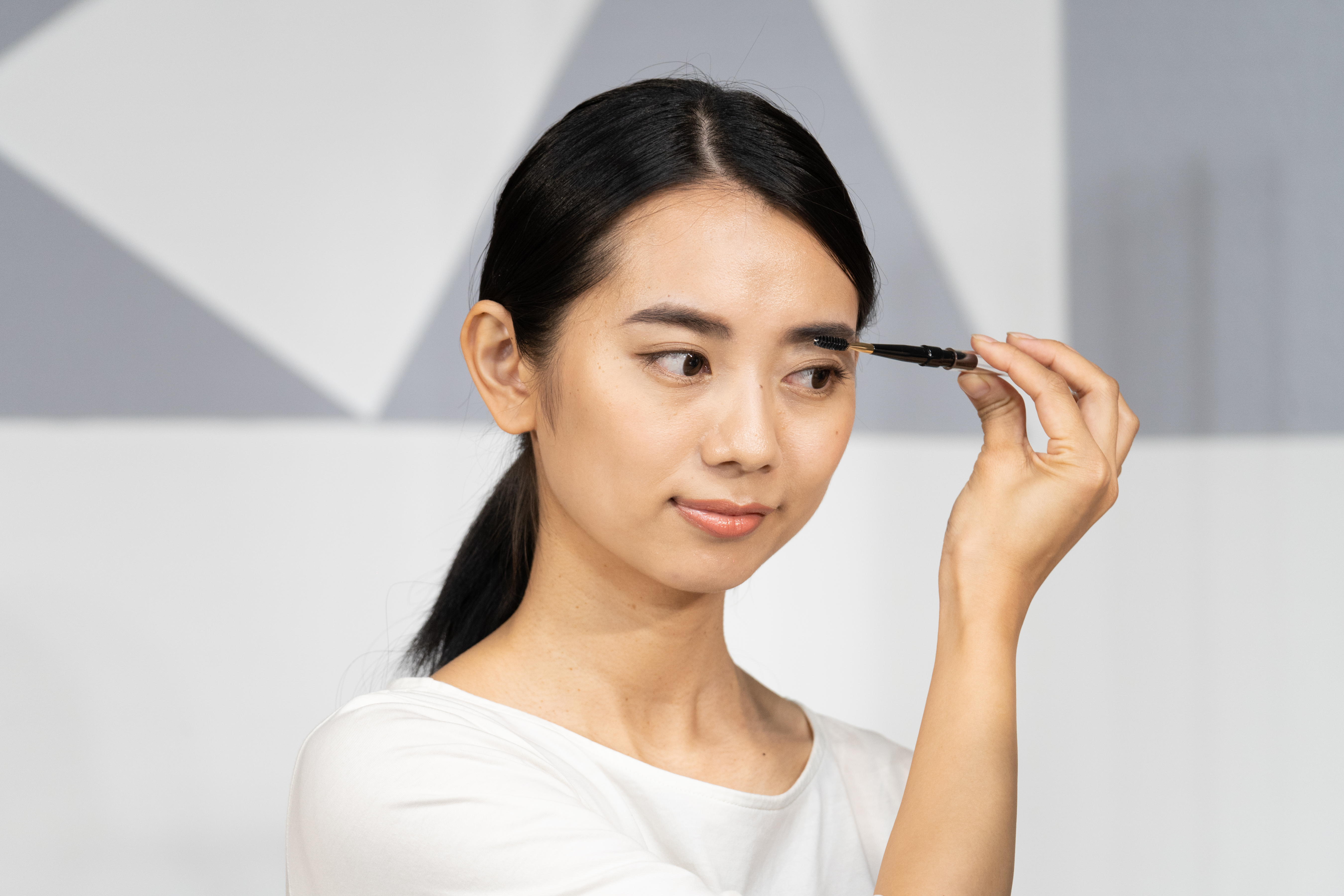 スクリューブラシを使って毛流れを整えると本来の眉の位置がわかりやすくなり、コシのあるアイブローブラシで普段よりしっかり眉の輪郭を描くことで、眉カットがしやすくなります。