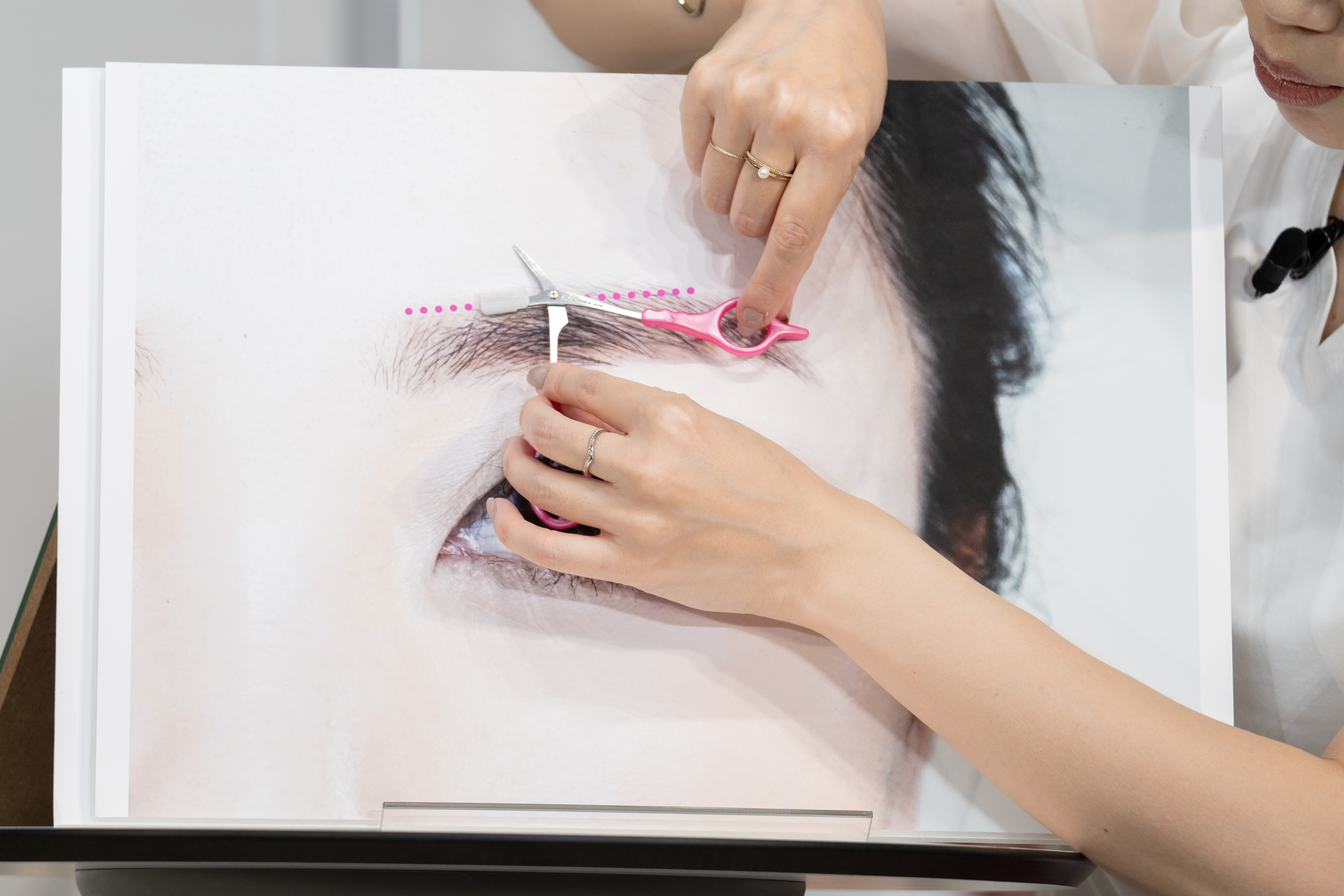 ポイントは、毛が密集した黒目の上部分だけをすくこと。黒目の上の毛をクシ部分ですくうように持ち上げ、1~2回カットするだけでも軽い印象に仕上げることができます。