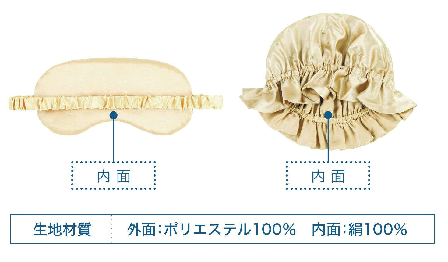 目もとや髪の毛に直接接する内側部分はシルク100%。滑らかな肌心地の生地で優しく包み、乾燥や摩擦から守ります。