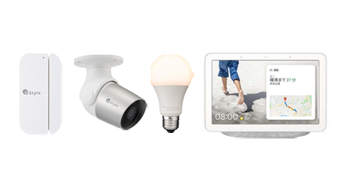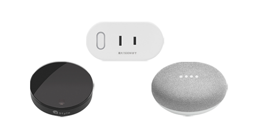 「スマートWi-Fiプラグ」はサーキュレーターやアンティークランプなど、「スマートマルチリモコン」はテレビやエアコンなどの家電を、アプリ「+Style」で操作できるほか、スマートスピーカー「Google Home Mini」でかんたんに音声コントロールが可能です。