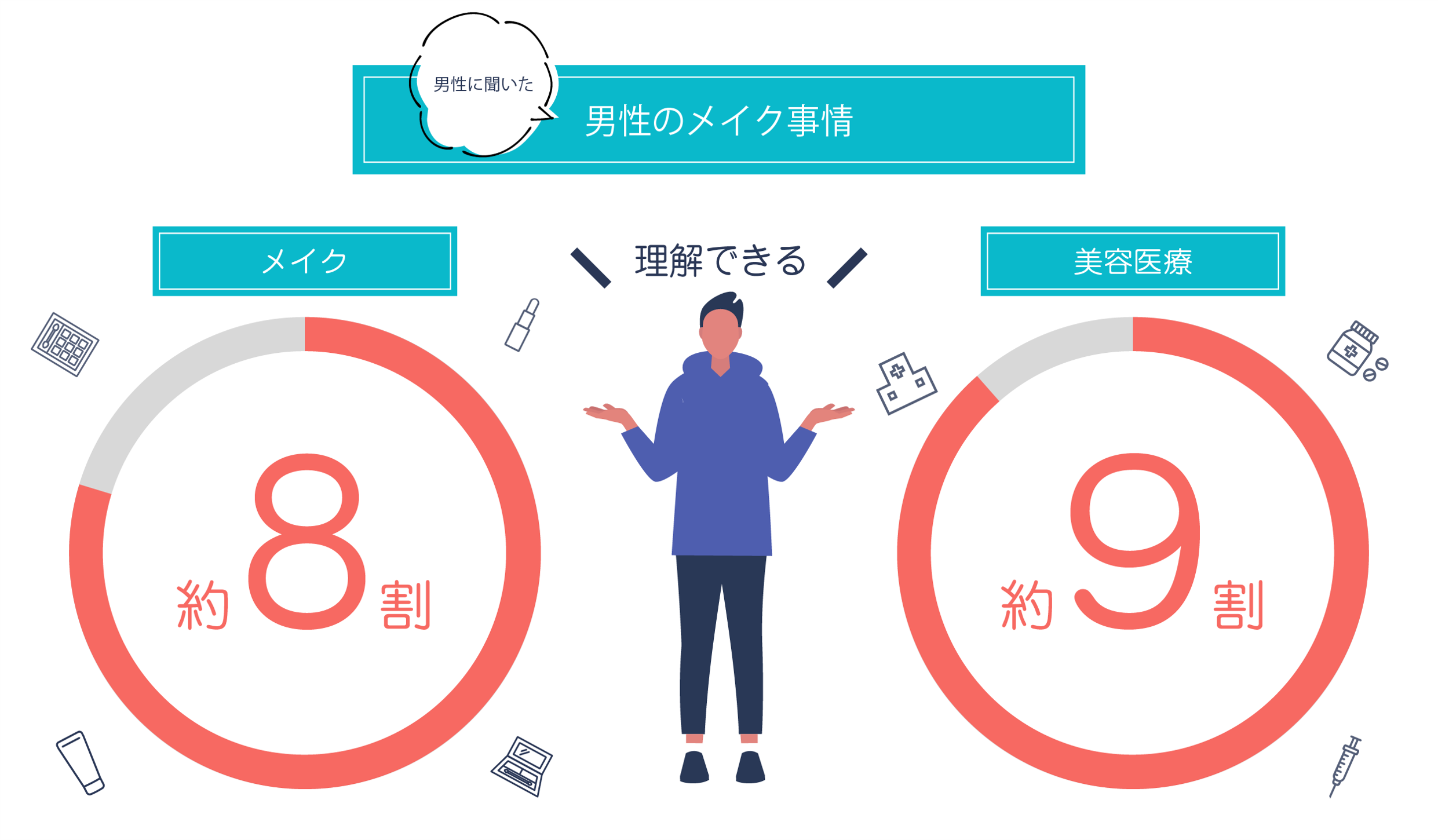 メイクをする、医療美容をする男性に対して、同性としてどう考えているかの調査をしたところ、眉を整える(描く)、コンシーラーを塗るなど、メイクを「理解できる」と回答したのは約8割(79.7%)。