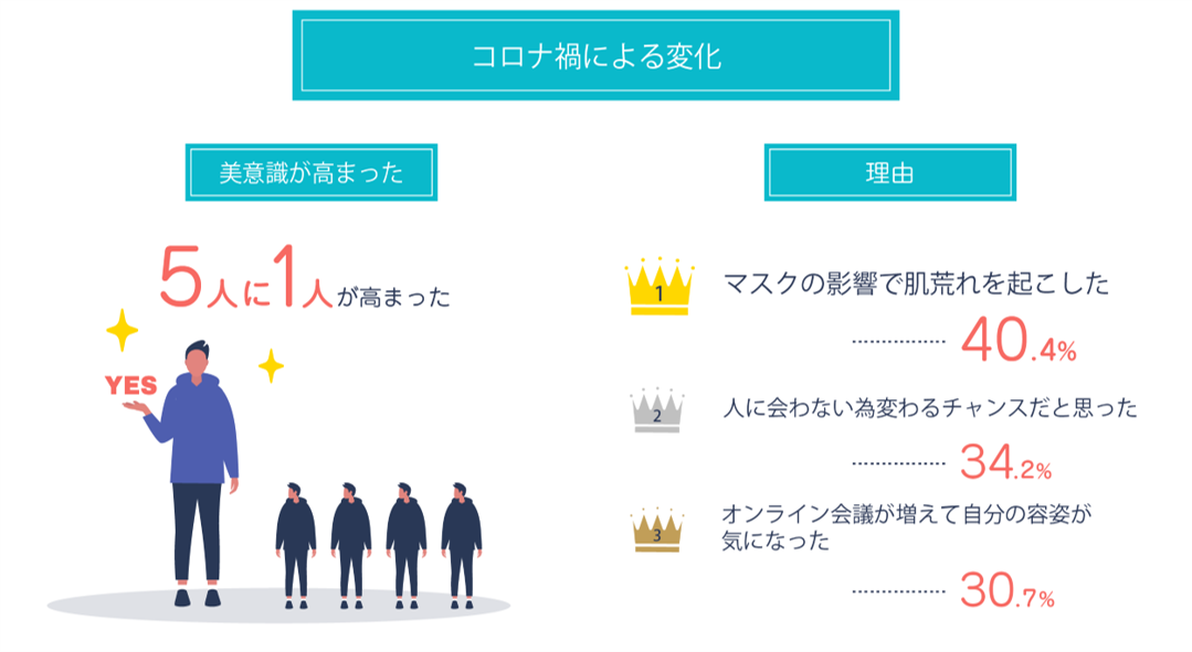 コロナ禍での美容意識の変化について、20代男性の約5人に1人(19.9%)が「コロナ禍で美容意識が高まった」と回答しました。