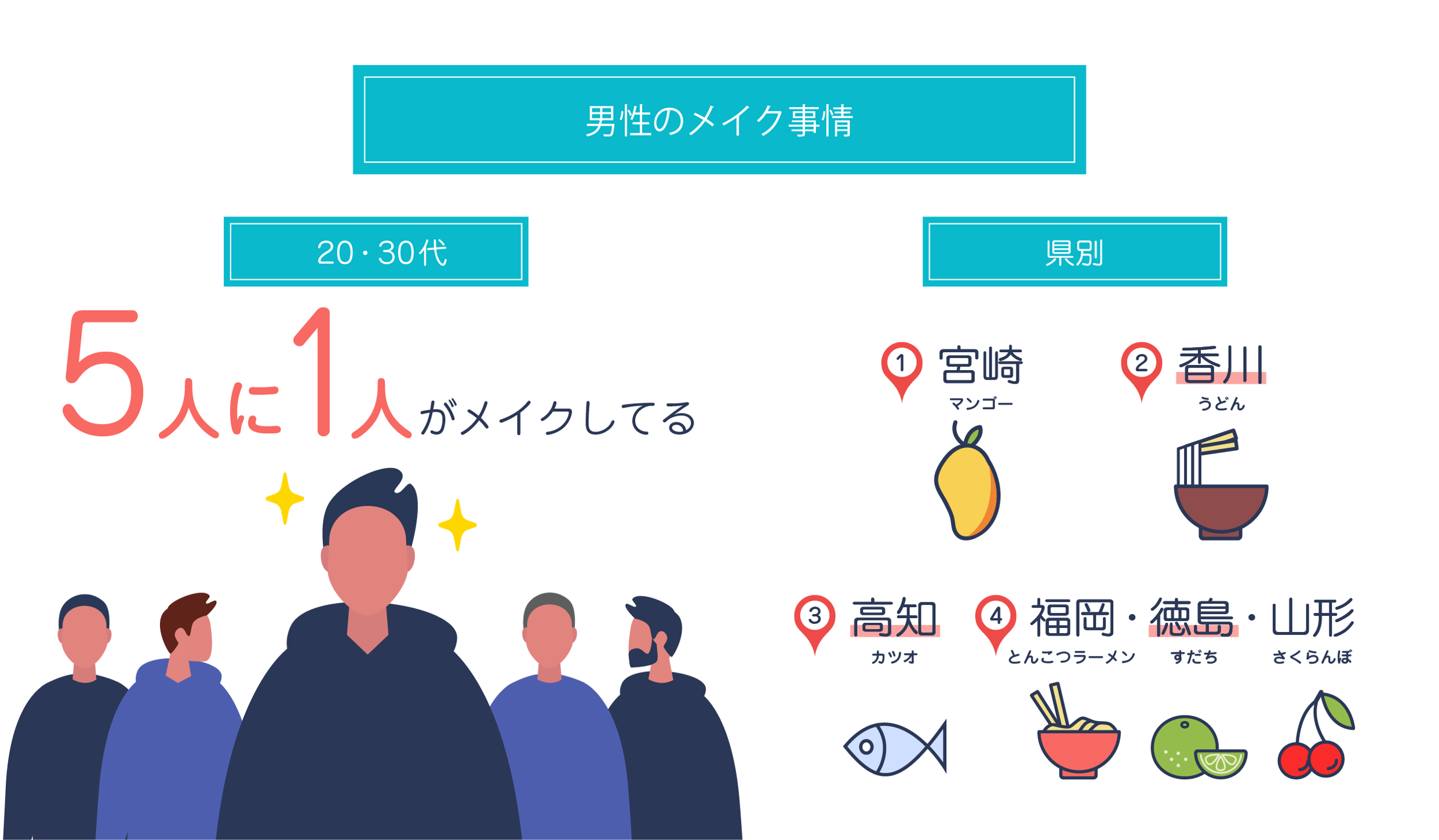 47都道府県で比較すると、実際にメイクをしている男性が多い都道府県は1位宮崎県(33.3%)、2位香川県(31.7%)、3位高知県(30.0%)と、上位3県では3割以上の男性がメイクをしており、次いで4位が福岡県・徳島県・山形県(26.7%)でした。