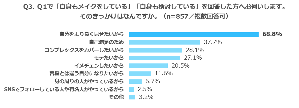 男性がメイクをする、したいと思うきっかけ1位は「自分をより良く見せたいから」(68.8%)。異性にモテたいという理由より、「自己満足のため」「コンプレックスカバー」など、自分のためにメイクをしたいと思う方が多いことがわかりました。
