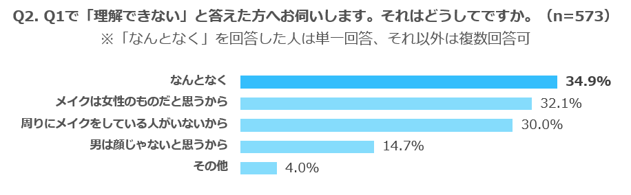 メイク男子を「理解できない」と回答した2割ほどの最も多い回答が「なんとなく(34.9%)」と、理由は自身でも明確にすることが難しいことが判明。