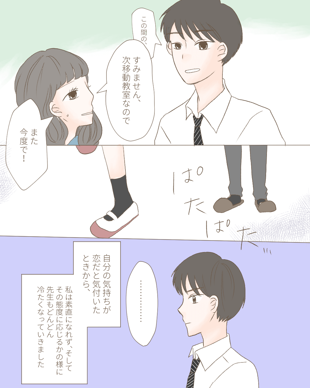 私の大切な初恋の話②【Lovely漫画】 オリジナル漫画 2022年3月29日 ▼前回のお話はこちら 私の大切な初恋の話①【Lovely漫画】 | Lovely[ラブリー] 忘れられない先生との大切な思い出©おはぎ/エピソード:菜の花 ▼次を読む 私の大切な初恋の話③【Lovely漫画】 | Lovely[ラブリー] クラスメイトからの告白。でも私の心の中には…©おはぎ/エピソード:菜の花 こちらもおすすめ! 好き避けして後悔している人がやるべきこと8選|嫌われたときの対処法はある? | Lovely[ラブリー] 好きな人ができて片思いをしている期間はとても楽しいもの。ですが、実際に本人を目の前にするとどうして良いかわからず、つい好き避けしてしまっている方も…!ですが、好き避けは後悔の元。成就する恋も成就しなくなってしまうので、対策を考えなければいけません。 実年齢より若く見える男性は最強説?特徴やおすすめ理由を徹底解説♡ | Lovely[ラブリー] 実年齢より若く見える男性が、それだけで魅力的に見えてしまうのはなぜなのでしょうか?今回は、実年齢より若く見える男性の特徴と、そんな男性と付き合うことのメリットをお伝えします。年齢を聞いてドキッとした経験のある方も、そんな人に出会いたい方も、必見です! 【男性心理】職場の男性が好意ある女性に見せる態度|どう対応するのが正解? | Lovely[ラブリー] 同じ職場の男性から好意ある態度を見せられたときは、どう対応するのが正解なのでしょうか?ちょっと素敵だなと感じている相手なら、なるべく素敵な女性に見られたいですよね!職場での脈アリ男性に対する上手な対応方法をご紹介します♪ ライター Lovely編集部 編集部レポや最新情報など皆さんの「知りたい」をお届け!よろしくお願いします♡ 目次Related article / 関連記事 オリジナル漫画 メンヘラ彼氏にサヨナラ【Lovely漫画】 ©みんみ 2022年3月29日 オリジナル漫画 年下イケメン彼氏に翻弄されるオンナの毎日#3【Lovely漫画】 ©みんみ 2022年3月29日 オリジナル漫画 2人暮らしのゆる家事日記~気まぐれ旦那の献立作りの巻き~後編【Lovely漫画】 ©みんみ 2022年3月29日 オリジナル漫画 年下イケメン彼氏に翻弄されるオンナの毎日#1【Lovely漫画】 ©みんみ「初めての○○の話 前編」 2022年3月29日 オリジナル漫画 年下イケメン彼氏に翻弄されるオンナの毎日#2【Lovely漫画】 ©みんみ「初めての○○の話 後編」 2022年3月29日 オリジナル漫画 よかったらシェアしてね! URLをコピーしました! URLをコピーしました! 【夢占い】彼女に浮気された夢の意味13選|もしかして予知夢?心理状態も解説 | plush 恋愛相談はどこで?相談所・掲示板・アプリでする?男友達にする?