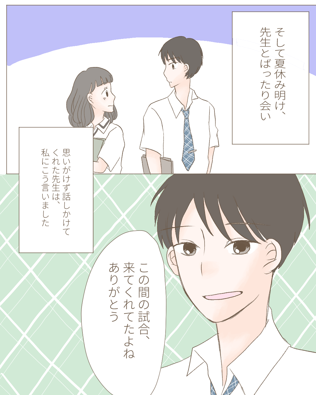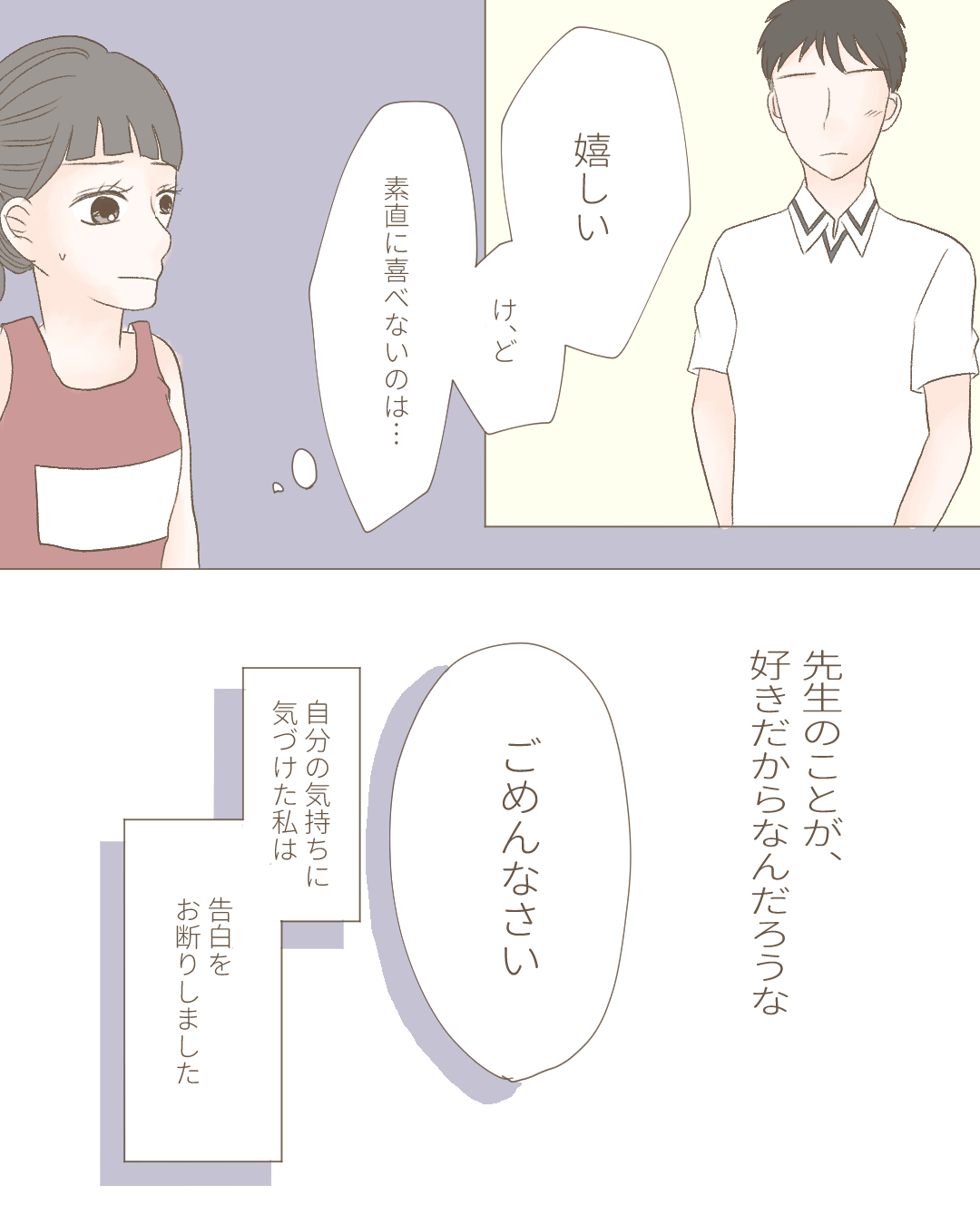 私の大切な初恋の話③【Lovely漫画】 オリジナル漫画 2022年3月29日 ▼前回のお話はこちら 私の大切な初恋の話②【Lovely漫画】 | Lovely[ラブリー] 苦手だった先生を意識するように…この気持ちって…?!©おはぎ/エピソード:菜の花 ▼次を読む 私の大切な初恋の話④【Lovely漫画】 | Lovely[ラブリー] 進展ないままもうすぐ卒業。勇気を出して…?!©おはぎ/エピソード:菜の花 こちらもおすすめ! 本命への男性心理がピュアすぎる!本命女性にだけ抱く感情や行動 | Lovely[ラブリー] 男性が本命に持つ心理について紹介します。「私は本命でいられているのかな?」という気持ちを相手に持っている女性は必見です!男性心理は意外と行動などに出ているのでしっかりと観察して相手の気持ちを見極めましょう。本命だけに示す心理をチェックしてくださいね。 脈なし逆転エピソード!脈なしから脈ありに変えた女性たちのテクニックとは? | Lovely[ラブリー] 脈なし逆転は存在する!恋する相手が脈ありか脈なしか、毎晩眠る前に「神様一生のお願い!」と祈る乙女心。「脈」は自分で手繰り寄せることができるんです♡ツワモノ女性のテクニックから、大好きな片思い中の彼のハートを一網打尽!恋を諦めるのはまだ早いですよ♪ 好きな人を推しにすれば諦められる?恋愛事情を確かめる方法や諦めるタイミングとは? | Lovely[ラブリー] 好きな人を諦めたいとき、どんな諦め方が自分にとってベストだと思いますか?本当に諦めていいのか悩んだり、諦めようと思ってもできなかったりと心を病むことがあるでしょう。今回は、諦めるタイミングやあきらめる方法などについて紹介します。 ライター Lovely編集部 編集部レポや最新情報など皆さんの「知りたい」をお届け!よろしくお願いします♡ 目次Related article / 関連記事 オリジナル漫画 メンヘラ彼氏にサヨナラ【Lovely漫画】 ©みんみ 2022年3月29日 オリジナル漫画 年下イケメン彼氏に翻弄されるオンナの毎日#3【Lovely漫画】 ©みんみ 2022年3月29日 オリジナル漫画 2人暮らしのゆる家事日記~気まぐれ旦那の献立作りの巻き~後編【Lovely漫画】 ©みんみ 2022年3月29日 オリジナル漫画 年下イケメン彼氏に翻弄されるオンナの毎日#1【Lovely漫画】 ©みんみ「初めての○○の話 前編」 2022年3月29日 オリジナル漫画 年下イケメン彼氏に翻弄されるオンナの毎日#2【Lovely漫画】 ©みんみ「初めての○○の話 後編」 2022年3月29日 オリジナル漫画 よかったらシェアしてね! URLをコピーしました! URLをコピーしました! 【夢占い】彼女に浮気された夢の意味13選|もしかして予知夢?心理状態も解説 | plush 恋愛相談はどこで?相談所・掲示板・アプリでする?男友達にする?