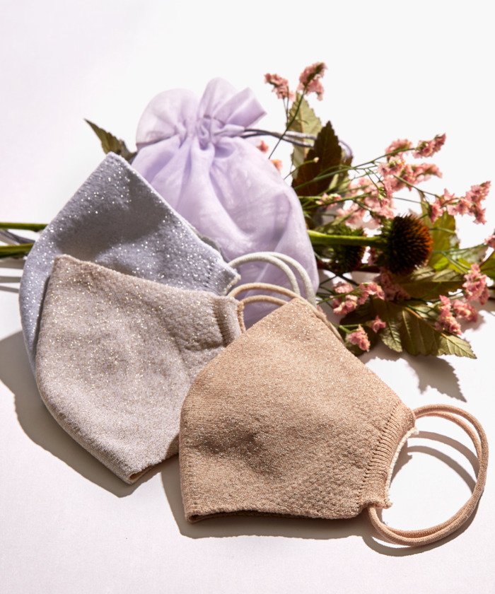 極細のラメ糸が1本1本撚られた糸を使用したニットマスク。肌に触れる裏面とゴム部分は、ラメなしストレッチ素材でソフトになるように作られているため、付け心地もなめらかです。チュール素材の巾着ポーチも可愛らしい♡
