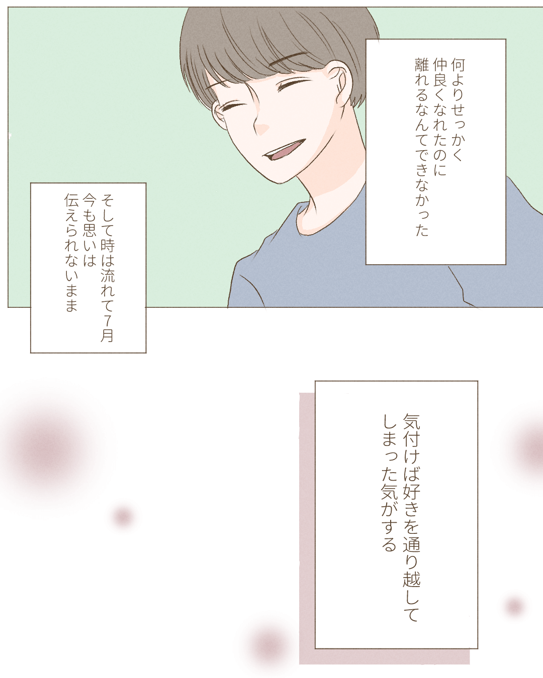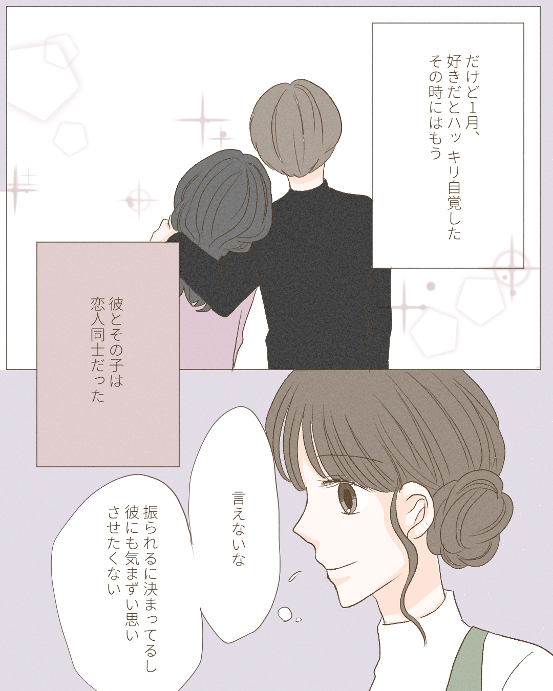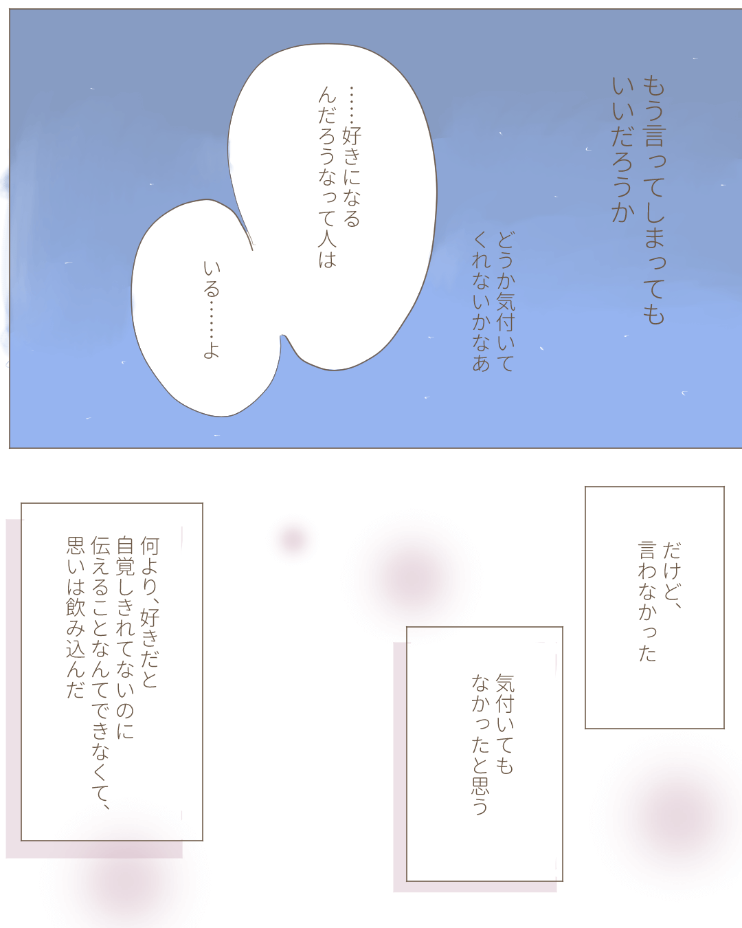伝えられない片想い【Lovely漫画】 オリジナル漫画 2022年3月29日 目次 ▼切なすぎる片想い…こちらもチェック 好きな人に片思いしている場合は向き合い方が肝心!辛い気持ちを楽しさに変換 片思いをしていると「辛い」と感じることもあります。好きだからこそ、辛いと感じてしまうのは当たり前のこと。しかし、できれば片思いを楽しみたいのも本音です。ちょっとした工夫で辛い気持ちを楽しさに変えて、片思いを満喫できるようになりましょう。 1週間の片思い【Lovely漫画】 部活の試合会場で目が離せなかった彼が諦められず…©はる/エピソード:匿名 「ずっと彼が好き」長い片思い。成就or諦める、あなたはどっち? 長く片思いしていると、そろそろ進展が欲しいと思ってしまいますよね。片思いを実らせるために何をするべきなのか、分からずにいる方もいるでしょう。また、いい加減諦めたいと考えている方もいるかもしれません。今回の記事では、長い片思いをしている女性に向けて、片思いのアプローチ方法や実らせ方、さらに見切りをつけるタイミングなどを紹介しています。長い片思いから次のステップへ進むために、是非読んでみてくださいね。 初恋は最長の片思い【Lovely漫画】 ©ぴまを/エピソード:七海 ライター Lovely編集部 編集部レポや最新情報など皆さんの「知りたい」をお届け!よろしくお願いします♡ Related article / 関連記事 オリジナル漫画 忘れられない恋【Lovely漫画】 中学・高校と一緒だった彼に6年間片思いしていた私。告白できないまま卒業の日がやってきて…。©beth/エピソード:すーちゃん 2025年2月6日 オリジナル漫画 君にとらわれ続ける。【Lovely漫画】 勇気があれば何か変わったかな…©suiさんオリジナルストーリー♡ 2023年12月12日 オリジナル漫画 すれ違ってしまった初彼が忘れられなくて…【Lovely漫画】 「私を幸せにしてくれてありがとう。君も幸せになってね」©しのだちかこ/エピソード:ブタゴリラ 2024年10月25日 オリジナル漫画 恋人と別れる【Lovely漫画】 ©azusa/エピソード:ダグ 2022年3月29日 オリジナル漫画 最高で最悪のプレゼントを君に。【Lovely漫画】 幼馴染だからこそ近くて遠い…想いがすれ違ってしまったお話©sui 2023年11月15日 オリジナル漫画 両片思い(?)【Lovely漫画】 高校時代に好きだったYくん。お互い意識しつつも何もなく卒業しました。しかし卒業後、Yくんが共通の友達と遊びに来てくれて…。… 2024年9月19日 オリジナル漫画 1週間の片思い【Lovely漫画】 部活の試合会場で目が離せなかった彼が諦められず…©はる/エピソード:匿名 2024年10月28日 オリジナル漫画 卒業まで待っててください【Lovely漫画】 私は学校の先生に恋をしました。©マナミン/エピソード:匿名 2022年3月29日 オリジナル漫画 謝り足りない「ごめんね」【Lovely漫画】 自分から手放したのに…忘れられないあの人©しのだちかこ/エピソード:にお 2024年12月3日 オリジナル漫画 彼の初恋の人【Lovely漫画】 ©azusa/エピソード:こぶたちゃん 2022年3月29日 オリジナル漫画 結婚破談した話【Lovely漫画】 ©azusa/エピソード:まあちゃん 2023年12月12日 オリジナル漫画 忘れられない思い出【Lovely漫画】 ©azusa/エピソード:@kadowaki_hiro 2022年3月29日 オリジナル漫画 ノンセクシュアルだと気付いた話【Lovely漫画】 ©azusa/エピソード:なつき 2022年3月29日 オリジナル漫画 今でも忘れられない人【Lovely漫画】 中3の頃に付き合っていた彼氏と久々に再会して…©なぁ/エピソード:n 2024年5月21日 切ない この恋、続けます【Lovely漫画】 嫌われてるかも…でも私は好き!©倖/エピソード:お砂糖。 2024年9月6日 切ない 片想い、現在進行形【Lovely漫画】 冷たくて悲しくなったり楽しくて期待したり…私はあなたが好きです。©サクライ/エピソード:ぽてと 2024年12月6日 恋愛漫画 その笑顔以外欲しくない。【Lovely漫画】 中学二年生から大学生になった今でも忘れられない彼女への想い…©倖/エピソード:えにまるくん 2024年8月1日 オリジナル漫画 私の激重カレシ【Lovely漫画】 「彼氏と長続きしない」と悩んでたけど、彼ならきっと…©高槻陽/エピソード:サリ丸 2024年9月20日 オリジナル漫画 恋愛より部活動を優先したあのとき【Lovely漫画】 スポーツ推薦で入学し、恋愛より部活動を優先した高校時代の思い出©倖/エピソード:ナナ 2024年11月29日 オリジナル漫画 自分を成長させてくれた人【Lovely漫画】 就職で上京し友達の居なかった頃、SNSで知り合ったある男性。次第に彼に惹かれ、あいまいな関係に。しかしある日彼から留学に行… 2024年8月14日 1 2 3 オリジナル漫画 よかったらシェアしてね! URLをコピーしました! URLをコピーしました! 【夢占い】彼女に浮気された夢の意味13選|もしかして予知夢?心理状態も解説 | plush 恋愛相談はどこで?相談所・掲示板・アプリでする?男友達にする?