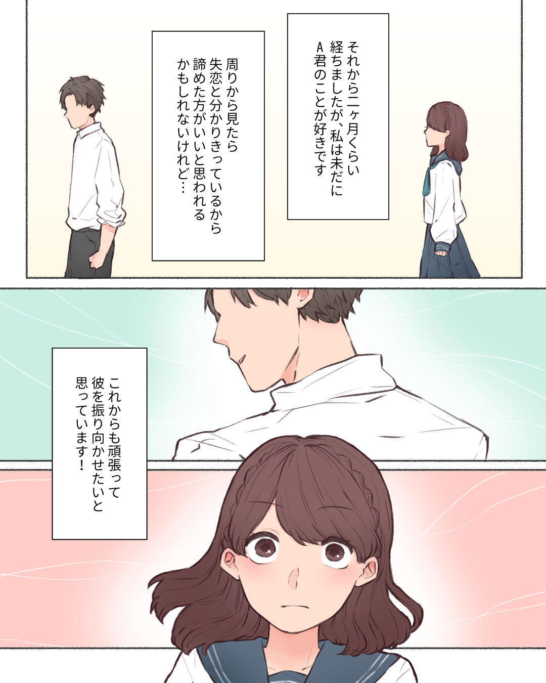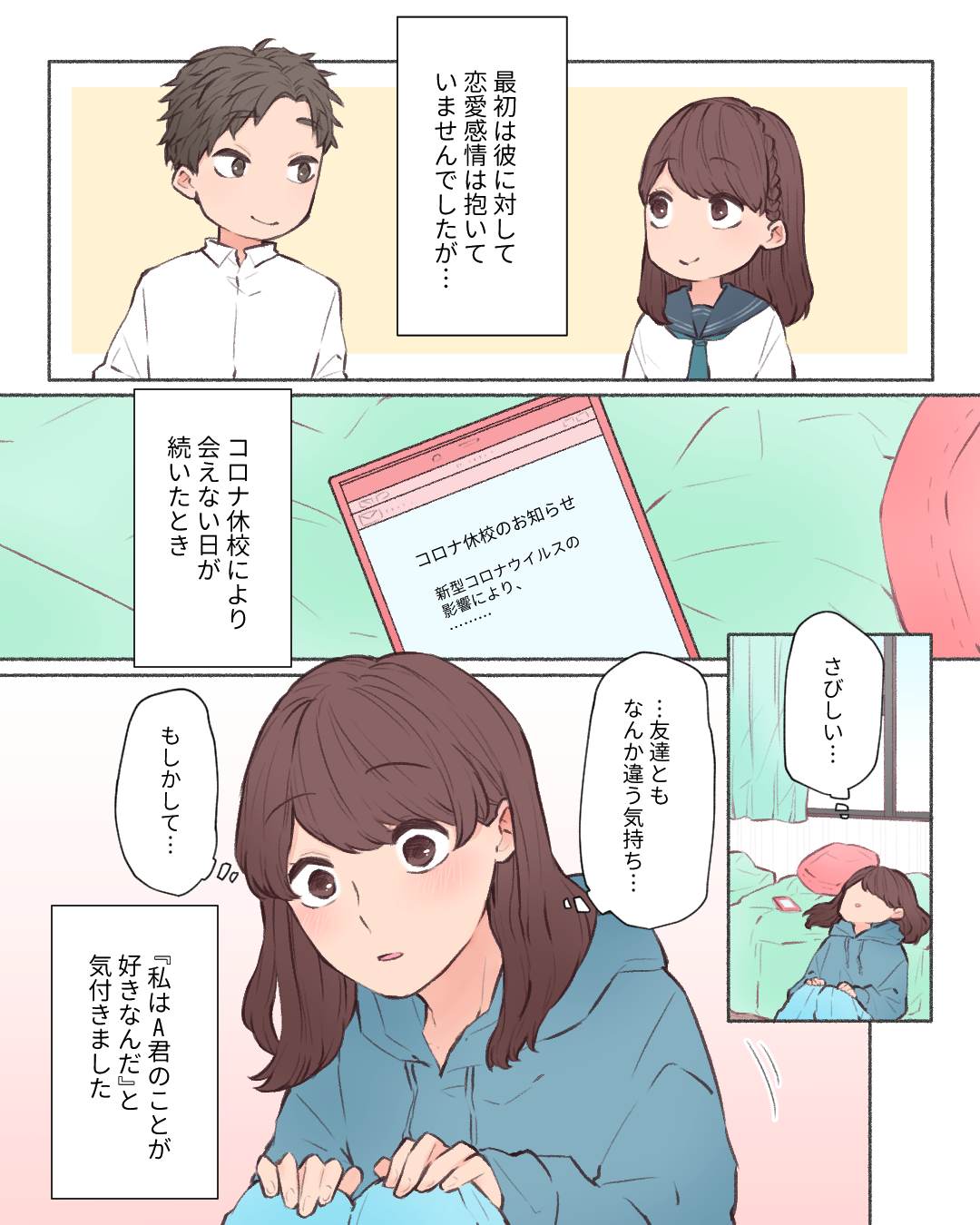 この恋、続けます【Lovely漫画】 オリジナル漫画 2024年9月6日 倖さんの作品をもっと読む! 倖さんの作品一覧【Lovely漫画】 倖さんの人気作をおまとめしています! こちらのLovely漫画もおすすめ! 幸せなカタオモイ【Lovely漫画】 体育館の仕切りネットにいる先輩に初恋。帰宅時間が遅くなったある日、密かに想いを寄せる先輩から声を掛けられ…©倖/エピソード:ぽよ。 忘れられない恋【Lovely漫画】 中学・高校と一緒だった彼に6年間片思いしていた私。告白できないまま卒業の日がやってきて…。©beth/エピソード:すーちゃん 先輩に恋してた5年間【Lovely漫画】 新しく入ったバイト先の3つ年上の先輩に一目惚れした高校1年生の私。想いを伝えることが出来ないまま、先輩は就職活動に専念するためバイトを辞めることに。そんな中、再び先輩に会えるチャンスが訪れて…©みほ/エピソード:匿名 ライター Lovely編集部 編集部レポや最新情報など皆さんの「知りたい」をお届け!よろしくお願いします♡ 目次Related article / 関連記事 オリジナル漫画 忘れられない恋【Lovely漫画】 中学・高校と一緒だった彼に6年間片思いしていた私。告白できないまま卒業の日がやってきて…。©beth/エピソード:すーちゃん 2025年2月6日 オリジナル漫画 君にとらわれ続ける。【Lovely漫画】 勇気があれば何か変わったかな…©suiさんオリジナルストーリー♡ 2023年12月12日 オリジナル漫画 すれ違ってしまった初彼が忘れられなくて…【Lovely漫画】 「私を幸せにしてくれてありがとう。君も幸せになってね」©しのだちかこ/エピソード:ブタゴリラ 2024年10月25日 オリジナル漫画 恋人と別れる【Lovely漫画】 ©azusa/エピソード:ダグ 2022年3月29日 オリジナル漫画 最高で最悪のプレゼントを君に。【Lovely漫画】 幼馴染だからこそ近くて遠い…想いがすれ違ってしまったお話©sui 2023年11月15日 オリジナル漫画 両片思い(?)【Lovely漫画】 高校時代に好きだったYくん。お互い意識しつつも何もなく卒業しました。しかし卒業後、Yくんが共通の友達と遊びに来てくれて…。… 2024年9月19日 オリジナル漫画 1週間の片思い【Lovely漫画】 部活の試合会場で目が離せなかった彼が諦められず…©はる/エピソード:匿名 2024年10月28日 オリジナル漫画 卒業まで待っててください【Lovely漫画】 私は学校の先生に恋をしました。©マナミン/エピソード:匿名 2022年3月29日 オリジナル漫画 謝り足りない「ごめんね」【Lovely漫画】 自分から手放したのに…忘れられないあの人©しのだちかこ/エピソード:にお 2024年12月3日 オリジナル漫画 彼の初恋の人【Lovely漫画】 ©azusa/エピソード:こぶたちゃん 2022年3月29日 オリジナル漫画 結婚破談した話【Lovely漫画】 ©azusa/エピソード:まあちゃん 2023年12月12日 オリジナル漫画 忘れられない思い出【Lovely漫画】 ©azusa/エピソード:@kadowaki_hiro 2022年3月29日 オリジナル漫画 ノンセクシュアルだと気付いた話【Lovely漫画】 ©azusa/エピソード:なつき 2022年3月29日 オリジナル漫画 今でも忘れられない人【Lovely漫画】 中3の頃に付き合っていた彼氏と久々に再会して…©なぁ/エピソード:n 2024年5月21日 切ない 伝えられない片想い【Lovely漫画】 気付いた時には遅くて、でもどうしようもないこの気持ち…©おはぎ/エピソード:ひまわり 2022年3月29日 切ない 片想い、現在進行形【Lovely漫画】 冷たくて悲しくなったり楽しくて期待したり…私はあなたが好きです。©サクライ/エピソード:ぽてと 2024年12月6日 恋愛漫画 その笑顔以外欲しくない。【Lovely漫画】 中学二年生から大学生になった今でも忘れられない彼女への想い…©倖/エピソード:えにまるくん 2024年8月1日 オリジナル漫画 私の激重カレシ【Lovely漫画】 「彼氏と長続きしない」と悩んでたけど、彼ならきっと…©高槻陽/エピソード:サリ丸 2024年9月20日 オリジナル漫画 恋愛より部活動を優先したあのとき【Lovely漫画】 スポーツ推薦で入学し、恋愛より部活動を優先した高校時代の思い出©倖/エピソード:ナナ 2024年11月29日 オリジナル漫画 自分を成長させてくれた人【Lovely漫画】 就職で上京し友達の居なかった頃、SNSで知り合ったある男性。次第に彼に惹かれ、あいまいな関係に。しかしある日彼から留学に行… 2024年8月14日 オリジナル漫画 よかったらシェアしてね! URLをコピーしました! URLをコピーしました! プライドだけ一丁前の男に騙されちゃダメ33【稲漫画】 早く寝るには?早く寝る方法とコツ11選!