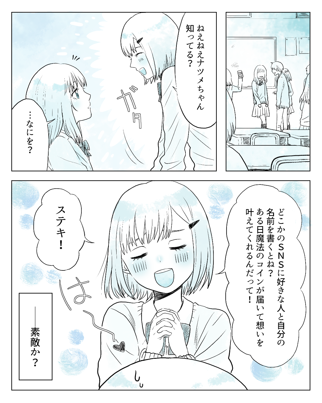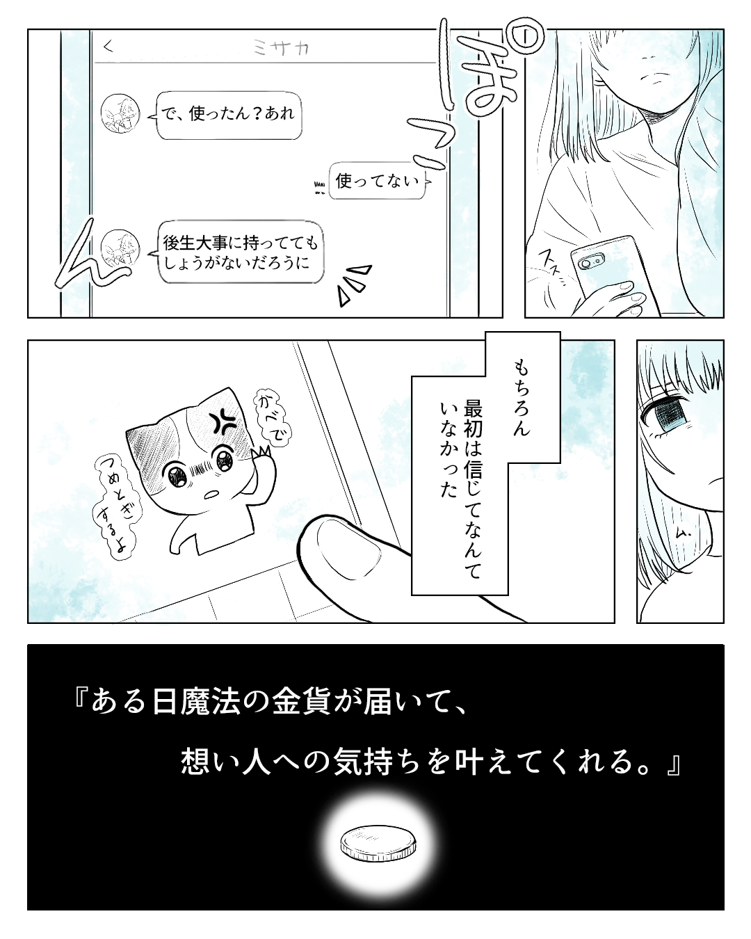 倉本ナツメ、高校2年生。マネージャーを務める野球部のエース・タカアキ先輩に想いを寄せるも、先輩には他校に彼女がいて絶賛片想い中…。親友のクルミは恋が叶う「魔法の金貨」があるなんて言うけど私は信じない!