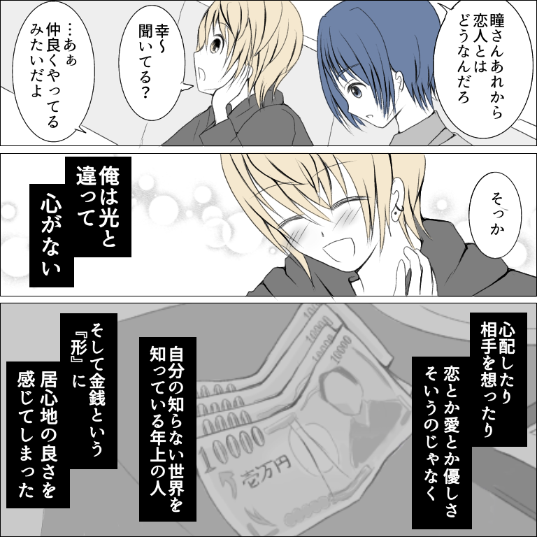 ママ活男子の恋 5【みわ柴ちゃん漫画】 オリジナル漫画 2022年3月29日 目次 ▼続きはコチラ ママ活男子の恋 6【みわ柴ちゃん漫画】 ママ活で出会った1人の女性に心を奪われていく、男子大学生のラブストーリー。(※このストーリーはフィクションです。) ©みわ柴ちゃん ▼前回のお話はコチラ ママ活男子の恋 4【みわ柴ちゃん漫画】 ママ活で出会った1人の女性に心を奪われていく、男子大学生のラブストーリー。(※このストーリーはフィクションです。) ©みわ柴ちゃん ▼連載を最初から読む ママ活男子の恋 1【みわ柴ちゃん漫画】 ママ活で出会った1人の女性に心を奪われていく、男子大学生のラブストーリー。(※このストーリーはフィクションです。) ©みわ柴ちゃん ▼みわ柴ちゃんのInstagramは画像をタップ♡ ▼こちらのLovely漫画もオススメ! 彼氏が白血病だとわかった日 1【まつり漫画】 ©まつり Lovelyオリジナル漫画 みんなの恋愛エピソードを漫画化!あなたのエピソードも漫画になるかも♡ ライター みわ柴ちゃん ダークな恋愛を描いています。楽しんで頂けるよう精一杯頑張ります!Instagram【@miwashibachan】 Related article / 関連記事 オリジナル漫画 メンヘラ彼氏にサヨナラ【Lovely漫画】 ©みんみ 2022年3月29日 オリジナル漫画 年下イケメン彼氏に翻弄されるオンナの毎日#3【Lovely漫画】 ©みんみ 2022年3月29日 オリジナル漫画 2人暮らしのゆる家事日記~気まぐれ旦那の献立作りの巻き~後編【Lovely漫画】 ©みんみ 2022年3月29日 オリジナル漫画 年下イケメン彼氏に翻弄されるオンナの毎日#1【Lovely漫画】 ©みんみ「初めての○○の話 前編」 2022年3月29日 オリジナル漫画 年下イケメン彼氏に翻弄されるオンナの毎日#2【Lovely漫画】 ©みんみ「初めての○○の話 後編」 2022年3月29日 1 2 オリジナル漫画 よかったらシェアしてね! URLをコピーしました! URLをコピーしました! 【夢占い】彼女に浮気された夢の意味13選|もしかして予知夢?心理状態も解説 | plush 恋愛相談はどこで?相談所・掲示板・アプリでする?男友達にする?