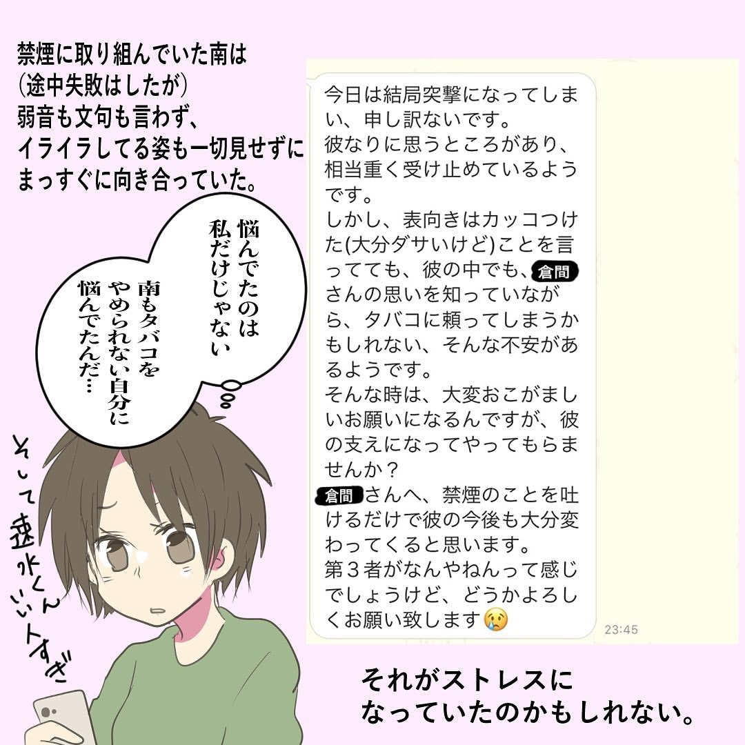 君と煙草と私(終)【倉間漫画】 オリジナル漫画 2022年3月29日 目次 ▼最新連載に続く…! タバコをやめた彼氏がエナジードリンク依存症になった話1【倉間漫画】 ほぼ毎日1箱吸っていた南(彼氏)さんが禁煙と向き合うお話続編!©倉間 こちらもおすすめ! Lovelyオリジナル漫画 みんなの恋愛エピソードを漫画化!あなたのエピソードも漫画になるかも♡ 彼に愛されてます 1【まつり漫画】 ©まつり 桜振る日に 0 -プロローグ-【magari漫画】 SNSでも大人気!みぎまがりさんの新連載スタート♡ ©magari ライター 倉間 旅行と酒を愛する会社員です!Instagram【@kurama__23】 Related article / 関連記事 倉間 初デートの話1【倉間漫画】 南くんと付き合う前のお話©倉間 2022年3月29日 倉間 初デートの話2(完)【倉間漫画】 南くんと付き合う前のお話©倉間 2022年3月29日 倉間 テレビ局でバイトしてたときの話1【倉間漫画】 2年間の奮闘記…!©倉間 2022年3月29日 倉間 テレビ局でバイトしてたときの話2【倉間漫画】 2年間の奮闘記…!©倉間 2022年3月29日 倉間 テレビ局でバイトしてたときの話3(完)【倉間漫画】 2年間の奮闘記…!©倉間 2022年3月29日 倉間 テレビ局でバイトしてたときの話~プロローグ~【倉間漫画】 2年間の奮闘記…!©倉間 2022年3月29日 倉間 趣味で繋がるSNSで出会った様々な人たち0【倉間漫画】 今や懐かしき某SNSで友達作りに奮闘していた記録©倉間 2022年3月29日 倉間 趣味で繋がるSNSで出会った様々な人たち1【倉間漫画】 ~アカウント作ってみた~©倉間 2022年3月29日 倉間 趣味で繋がるSNSで出会った様々な人たち2【倉間漫画】 ~どんな人たち?~©倉間 2022年3月29日 倉間 趣味で繋がるSNSで出会った様々な人たち3【倉間漫画】 ~会ってみた①~©倉間 2022年3月29日 倉間 趣味で繋がるSNSで出会った様々な人たち4【倉間漫画】 ~会ってみた②~©倉間 2022年3月29日 倉間 趣味で繋がるSNSで出会った様々な人たち5【倉間漫画】 ~初めてのオフ会~©倉間 2022年3月29日 倉間 趣味で繋がるSNSで出会った様々な人たち6【倉間漫画】 ~初めてのオフ会②~©倉間 2022年3月29日 倉間 趣味で繋がるSNSで出会った様々な人たち7【倉間漫画】 ~新たな出会い~©倉間 2022年3月29日 倉間 【最新話】趣味で繋がるSNSで出会った様々な人たち(終)【倉間漫画】 ~オフ会は楽しい!~©倉間 2022年3月29日 倉間 君と煙草と私1【倉間漫画】 倉間さんと南さん(彼氏)が交際2年目くらいのときのお話©倉間 2022年3月29日 倉間 君と煙草と私2【倉間漫画】 倉間さんと南さん(彼氏)が交際2年目くらいのときのお話©倉間 2022年3月29日 倉間 君と煙草と私3【倉間漫画】 倉間さんと南さん(彼氏)が交際2年目くらいのときのお話©倉間 2022年3月29日 倉間 君と煙草と私4【倉間漫画】 倉間さんと南さん(彼氏)が交際2年目くらいのときのお話©倉間 2022年3月29日 倉間 タバコをやめた彼氏がエナジードリンク依存症になった話1【倉間漫画】 ほぼ毎日1箱吸っていた南(彼氏)さんが禁煙と向き合うお話続編!©倉間 2022年3月29日 1 2 オリジナル漫画 よかったらシェアしてね! URLをコピーしました! URLをコピーしました! 【夢占い】彼女に浮気された夢の意味13選|もしかして予知夢?心理状態も解説 | plush 恋愛相談はどこで?相談所・掲示板・アプリでする?男友達にする?