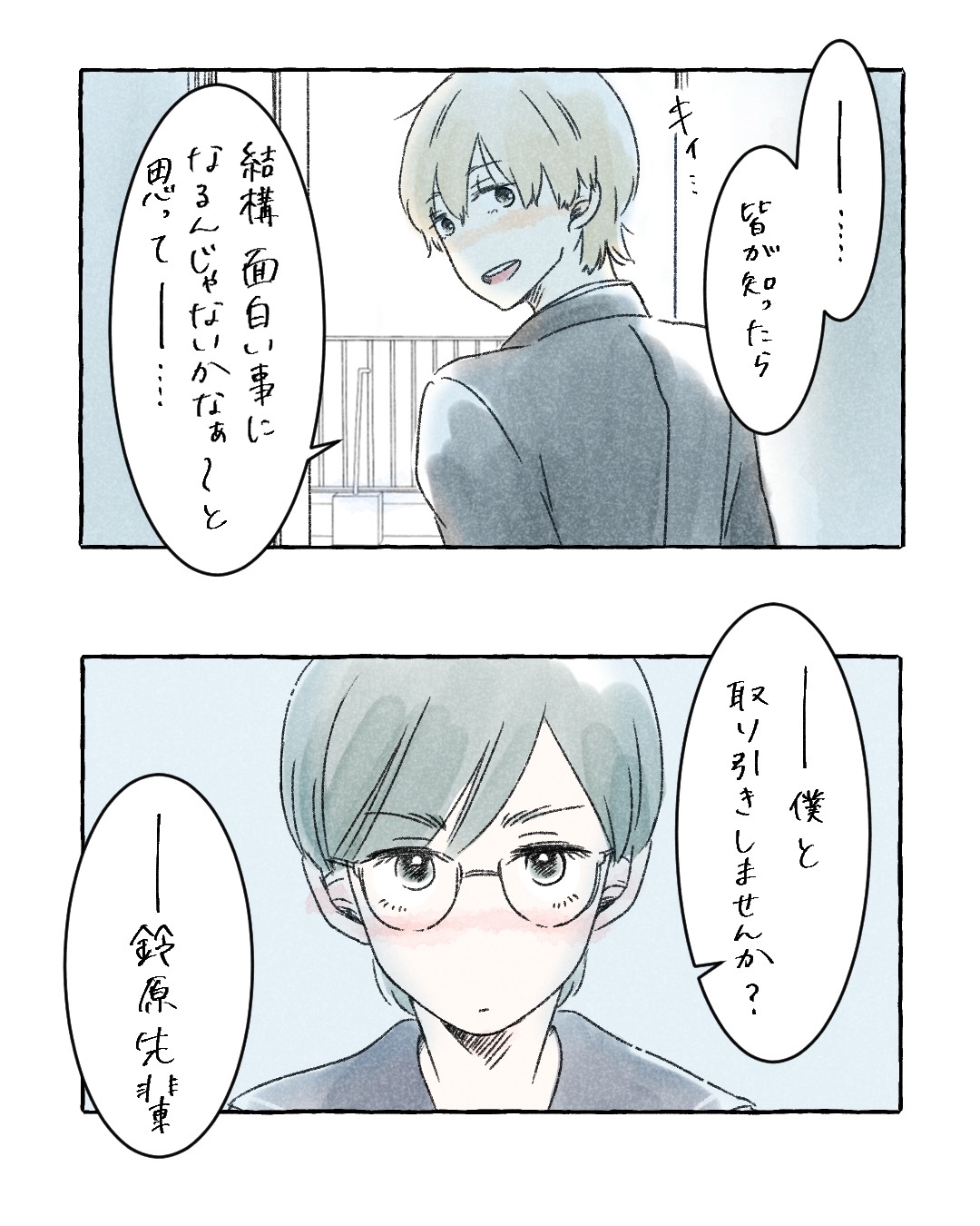 優等生のあの子の秘密 第3話【真白ばに漫画】 オリジナル漫画 2022年3月29日 目次 ▼次を読む 優等生のあの子の秘密 第4話【真白ばに漫画】 『世の中はクソだ』-見た目と噂で周りから恐れられている宇野は、才色兼備の生徒会長・鈴原の秘密を知ることになる…。※このストーリーはフィクションです。©真白ばに ▼真白ばにさんの連載一覧はこちら 短編~連載まで!様々な恋物語 短編~連載まで様々な恋物語を大人気更新中!©真白ばに こちらのLovely漫画もおすすめ! ママ活男子の恋 1【みわ柴ちゃん漫画】 ママ活で出会った1人の女性に心を奪われていく、男子大学生のラブストーリー。(※このストーリーはフィクションです。) ©みわ柴ちゃん 口コミ8万件以上!当たると評判の電話占い「みん電占い」で好きな人の気持ちを聞いてみた[PR] 「電話占いって当たるの…?」不安な人も多いですよね。電話占いの『みんなの電話占い』は8万件以上の口コミや占い師の先生との実際の会話まで見れる体験談も豊富だから安心です。さらに、Lovelyサイトから登録した方限定で、初回3000円オフクーポンをプレゼント! ライター 真白ばに 短編~連載まで様々な恋物語を大人気更新中!Instagram【vani.co303】 Related article / 関連記事 オリジナル漫画 顔に出にくいカップルの話【Lovely漫画】 azusaさんオリジナル、読み切り短編漫画の連載スタート!(不定期更新) 2022年3月29日 オリジナル漫画 里中さんと山内くんの両片想い【Lovely漫画】 告白しようと思うもいつも失敗してしまう里中さんと、勇気を出せずにいる山内くんの、初々しい短編連載スタート!©azusa 2022年3月29日 オリジナル漫画 結局、恋愛にも就職にもスナックでのバイトが一番役に立ったという話1【Lovely漫画】 女度アップや仕事につかえる小ネタなどを綴る新連載スタート!©ホシノモナカ 2022年3月29日 オリジナル漫画 2人暮らしのゆる家事日記~再生栽培のススメ~【連載】【Lovely漫画】 ©みんみ 2022年3月29日 オリジナル漫画 年下イケメン彼氏に翻弄されるオンナの毎日#4【Lovely漫画】 ©みんみ 2022年3月29日 恋愛漫画 お付き合い編 2【magari漫画】 みぎと雪さんのカップルエッセイ♡ ©magari 2022年10月5日 恋愛漫画 お付き合い編 3【magari漫画】 みぎと雪さんのカップルエッセイ♡ ©magari 2022年10月5日 恋愛漫画 お付き合い編 4【magari漫画】 みぎと雪さんのカップルエッセイ♡ ©magari 2022年10月5日 恋愛漫画 お付き合い編 5【magari漫画】 みぎと雪さんのカップルエッセイ♡ ©magari 2022年10月5日 恋愛漫画 お付き合い編 6【magari漫画】 みぎと雪さんのカップルエッセイ♡ ©magari 2022年10月5日 恋愛漫画 お付き合い編 7【magari漫画】 みぎと雪さんのカップルエッセイ♡ ©magari 2022年10月5日 連載 20歳で妊娠した話1【azusa】 ~わたしと夫がぷいちゃんに出会うまで~©azusa 2022年3月29日 連載 20歳で妊娠した話2【azusa】 ~わたしと夫がぷいちゃんに出会うまで~©azusa 2022年3月29日 連載 20歳で妊娠した話3【azusa】 ~わたしと夫がぷいちゃんに出会うまで~©azusa 2022年3月29日 連載 20歳で妊娠した話4【azusa】 ~わたしと夫がぷいちゃんに出会うまで~©azusa 2022年3月29日 連載 20歳で妊娠した話5【azusa】 ~わたしと夫がぷいちゃんに出会うまで~©azusa 2022年3月29日 連載 20歳で妊娠した話6【azusa】 ~わたしと夫がぷいちゃんに出会うまで~©azusa 2022年3月29日 連載 20歳で妊娠した話7【azusa】 ~わたしと夫がぷいちゃんに出会うまで~©azusa 2022年3月29日 連載 20歳で妊娠した話8【azusa】 ~わたしと夫がぷいちゃんに出会うまで~©azusa 2022年3月29日 連載 20歳で妊娠した話9【azusa】 ~わたしと夫がぷいちゃんに出会うまで~©azusa 2022年3月29日 1 2 オリジナル漫画 よかったらシェアしてね! URLをコピーしました! URLをコピーしました! 【夢占い】彼女に浮気された夢の意味13選|もしかして予知夢?心理状態も解説 | plush 恋愛相談はどこで?相談所・掲示板・アプリでする?男友達にする?