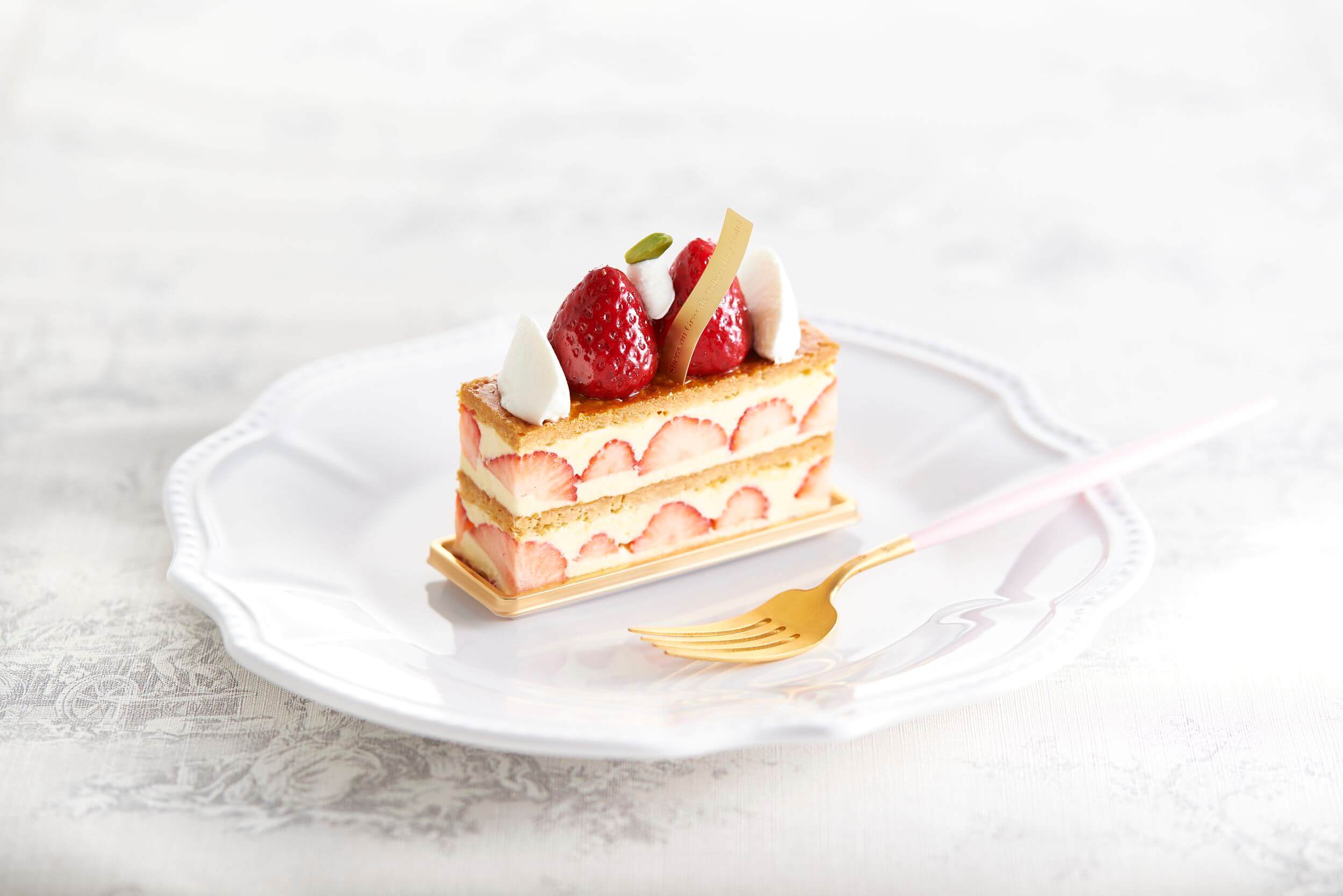 フランボワーズのジャムを塗ったパイ生地で、バタークリーム、メレンゲ、カスタードを混ぜたムースリーヌとたっぷりのいちごをサンドしたミルフィーユに、大粒のいちごと生クリームをトッピング。