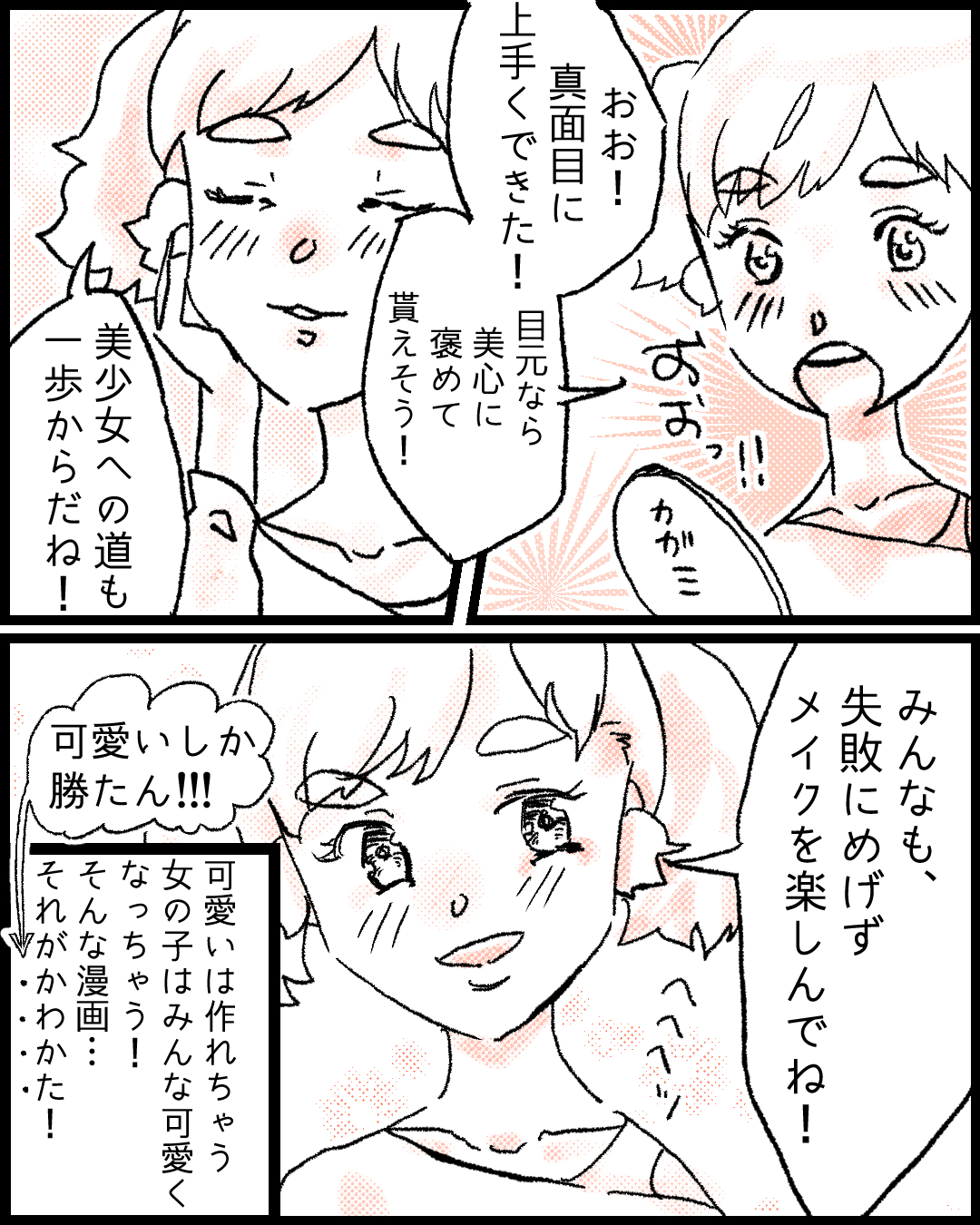 可愛いしか勝たん!!! 葉月の復習編(後編)【Lovely創作漫画】 オリジナル漫画 2022年3月29日 ▼前編はこちら 可愛いしか勝たん!!! 葉月の復習編(前編)【Lovely創作漫画】 告白に失敗し、幼馴染の美心に可愛くなるコツを伝授してもらっている葉月(16)。パーソナルカラー、二重メイク、涙袋メイクを習得して練習あるのみ!な日々。告白のリベンジに向けて復習だ!©ゆに 涙袋メイクをもっと知りたい人はこちらもチェック♪ 涙袋メイクの書き方・作り方!アイシャドウで自然に作れる! アイシャドウで涙袋メイクをしたいという人も多いでしょう。しかし作り方や書き方がいまいちわからないものです。どのような作り方や書き方をすれば、うまく涙袋を作れるようになるのでしょうか。そこで今回は、アイシャドウで涙袋メイクをするやり方を紹介していきます。 キャンメイクで涙袋メイク!おすすめの商品はどれ? キャンメイクで涙袋メイクをして愛され顔になりませんか?キャンメイクのコスメは涙袋を作るのにとても向いています。涙袋の作り方は簡単ですし、キャンメイクコスメの使い方も簡単です!涙袋を作って女性らしいキュートで優しい顔を目指しましょう! ▼続きを読む 可愛いしか勝たん!!! 6【Lovely創作漫画】 告白に失敗し、幼馴染の美心に可愛くなるコツを伝授してもらっている葉月(16)。パーソナルカラー、二重メイク、涙袋メイクを習得!復習もしたし、いい感じ♪…と思ったら、「化粧品の使用期限」で怒られることに?!©ゆに ライター Lovely編集部 編集部レポや最新情報など皆さんの「知りたい」をお届け!よろしくお願いします♡ 目次Related article / 関連記事 オリジナル漫画 メンヘラ彼氏にサヨナラ【Lovely漫画】 ©みんみ 2022年3月29日 オリジナル漫画 年下イケメン彼氏に翻弄されるオンナの毎日#3【Lovely漫画】 ©みんみ 2022年3月29日 オリジナル漫画 2人暮らしのゆる家事日記~気まぐれ旦那の献立作りの巻き~後編【Lovely漫画】 ©みんみ 2022年3月29日 オリジナル漫画 年下イケメン彼氏に翻弄されるオンナの毎日#1【Lovely漫画】 ©みんみ「初めての○○の話 前編」 2022年3月29日 オリジナル漫画 年下イケメン彼氏に翻弄されるオンナの毎日#2【Lovely漫画】 ©みんみ「初めての○○の話 後編」 2022年3月29日 オリジナル漫画 よかったらシェアしてね! URLをコピーしました! URLをコピーしました! 【夢占い】彼女に浮気された夢の意味13選|もしかして予知夢?心理状態も解説 | plush 恋愛相談はどこで?相談所・掲示板・アプリでする?男友達にする?