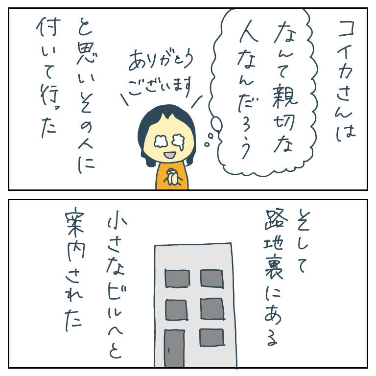 道を教えてもらいたかっただけなのに!!というはなし2【稲漫画】 オリジナル漫画 2022年3月29日 ▼前回のお話はこちら 道を教えてもらいたかっただけなのに!!というはなし1【稲漫画】 不慣れな土地で起こった10年以上前の恐怖体験©稲 ▼次を読む 道を教えてもらいたかっただけなのに!!というはなし3【稲漫画】 不慣れな土地で起こった10年以上前の恐怖体験©稲 ▼稲さんの連載一覧はこちら 毎日更新!サラリーウーマン稲のエッセイ漫画 毎日更新!サラリーウーマン稲のエッセイ漫画 こちらもおすすめ! Lovelyオリジナル漫画 みんなの恋愛エピソードを漫画化!あなたのエピソードも漫画になるかも♡ ライター 稲 エッセイ漫画を描くサラリーウーマン!Instagram【@inasan_mainichi】 目次Related article / 関連記事 稲 近所のお爺さんが怖かったはなし4【稲漫画】 4歳で経験した恐怖の話!©稲 2022年3月29日 稲 近所のお爺さんが怖かったはなし5【稲漫画】 4歳で経験した恐怖の話!©稲 2022年3月29日 稲 近所のお爺さんが怖かったはなし6【稲漫画】 4歳で経験した恐怖の話!©稲 2022年3月29日 稲 近所のお爺さんが怖かったはなし3【稲漫画】 4歳で経験した恐怖の話!©稲 2022年3月29日 稲 近所のお爺さんが怖かったはなし2【稲漫画】 4歳で経験した恐怖の話!©稲 2022年3月29日 稲 近所のお爺さんが怖かったはなし1【稲漫画】 4歳で経験した恐怖の話!©稲 2022年3月29日 稲 おかしな引っ越し挨拶のはなし4(完)【稲漫画】 一人暮らしの学生に起きた恐怖体験!©稲 2022年3月29日 稲 おかしな引っ越し挨拶のはなし3【稲漫画】 一人暮らしの学生に起きた恐怖体験!©稲 2022年3月29日 稲 おかしな引っ越し挨拶のはなし2【稲漫画】 一人暮らしの学生に起きた恐怖体験!©稲 2022年3月29日 稲 おかしな引っ越し挨拶のはなし1【稲漫画】 一人暮らしの学生に起きた恐怖体験!©稲 2022年3月29日 稲 警察を名乗る人から電話があったはなし4(完)【稲漫画】 キャバ嬢の恐怖体験!©稲 2022年3月29日 稲 警察を名乗る人から電話があったはなし3【稲漫画】 キャバ嬢の恐怖体験!©稲 2022年3月29日 稲 警察を名乗る人から電話があったはなし2【稲漫画】 キャバ嬢の恐怖体験!©稲 2022年3月29日 稲 警察を名乗る人から電話があったはなし1【稲漫画】 キャバ嬢の恐怖体験!©稲 2022年3月29日 稲 カットモデル不審者のはなし5(完)【稲漫画】 試験でクタクタだった高校生の恐怖体験!©稲 2022年3月29日 稲 カットモデル不審者のはなし4【稲漫画】 試験でクタクタだった高校生の恐怖体験!©稲 2022年3月29日 稲 カットモデル不審者のはなし3【稲漫画】 試験でクタクタだった高校生の恐怖体験!©稲 2022年3月29日 稲 カットモデル不審者のはなし2【稲漫画】 試験でクタクタだった高校生の恐怖体験!©稲 2022年3月29日 稲 カットモデル不審者のはなし1【稲漫画】 試験でクタクタだった高校生の恐怖体験!©稲 2022年3月29日 稲 ショッピングモールの覆面調査不審者のはなし5(完)【稲漫画】 やや謎が残る不審者の恐怖体験!©稲 2022年3月29日 オリジナル漫画 よかったらシェアしてね! URLをコピーしました! URLをコピーしました! 【夢占い】彼女に浮気された夢の意味13選|もしかして予知夢?心理状態も解説 | plush 恋愛相談はどこで?相談所・掲示板・アプリでする?男友達にする?