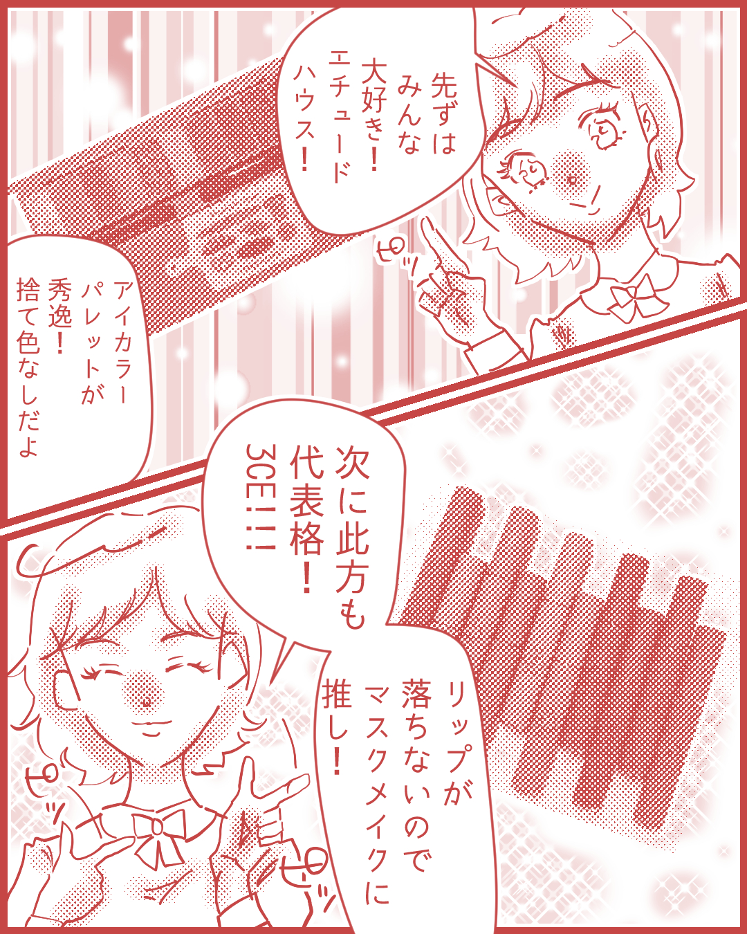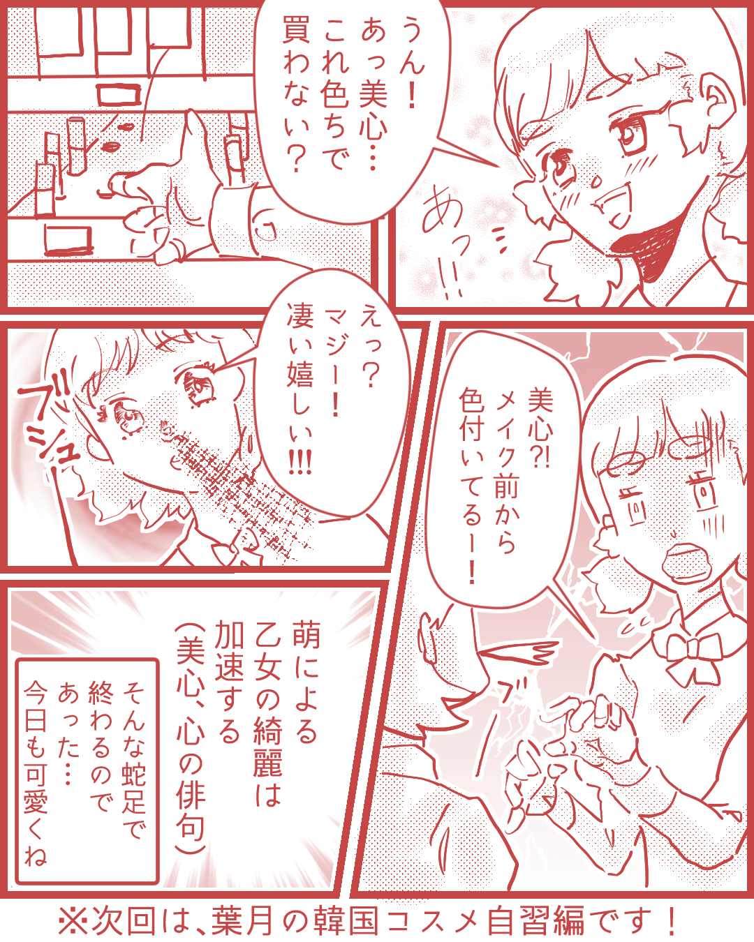 可愛いしか勝たん!!! 7【Lovely創作漫画】 オリジナル漫画 2022年3月29日 ▼前回のお話はこちら 可愛いしか勝たん!!! 6【Lovely創作漫画】 告白に失敗し、幼馴染の美心に可愛くなるコツを伝授してもらっている葉月(16)。パーソナルカラー、二重メイク、涙袋メイクを習得!復習もしたし、いい感じ♪…と思ったら、「化粧品の使用期限」で怒られることに?!©ゆに ▼3CEのおすすめ商品はこちら! 韓国コスメ3CEのおすすめ商品7選!絶対買いたいアイテムは? 韓国発の3CEコスメブランドは、日本の女性の注目を集めています。 カラーの発色の良さや可愛さなどが、韓国コスメの3CEの魅力です。 3CEのおすすめ人気商品を紹介します。 3CEは、洗礼されたデザインでポップな可愛さのおすすめコスメです。 韓国コスメをもっと知りたい人はこちら! 【韓国コスメ】アイシャドウパレットの人気ブランドのおすすめ7選! 韓国コスメはプチプラでとても人気です。そんな韓国コスメですが、アイシャドウパレットがとても優秀だと話題になっています。アイメイクに欠かせないアイシャドウパレットですが、今回は韓国コスメのおすすめ人気ブランドを7選ご紹介します。 韓国コスメの人気おすすめブランド・化粧品ランキング【2021】 ファンデーション、化粧水、美白、下地と、韓国コスメは日本でも幅広い世代に大人気です。あらゆる世代に対応した韓国コスメなら、きっとあなたに合うおすすめブランドが見つかるはず。今回は美容大国韓国の、2021年度版人気おすすめコスメブランドを紹介します。 次を読む 可愛いしか勝たん!!! 7.5【Lovely創作漫画】 告白リベンジに向けて幼馴染の美心にメイクレッスンを受ける葉月(16)。トレンドのコスメも買ったし、今回はトレンドメイク「桃メイク」に挑戦だ!©ゆに ライター Lovely編集部 編集部レポや最新情報など皆さんの「知りたい」をお届け!よろしくお願いします♡ 目次Related article / 関連記事 オリジナル漫画 メンヘラ彼氏にサヨナラ【Lovely漫画】 ©みんみ 2022年3月29日 オリジナル漫画 年下イケメン彼氏に翻弄されるオンナの毎日#3【Lovely漫画】 ©みんみ 2022年3月29日 オリジナル漫画 2人暮らしのゆる家事日記~気まぐれ旦那の献立作りの巻き~後編【Lovely漫画】 ©みんみ 2022年3月29日 オリジナル漫画 年下イケメン彼氏に翻弄されるオンナの毎日#1【Lovely漫画】 ©みんみ「初めての○○の話 前編」 2022年3月29日 オリジナル漫画 年下イケメン彼氏に翻弄されるオンナの毎日#2【Lovely漫画】 ©みんみ「初めての○○の話 後編」 2022年3月29日 オリジナル漫画 よかったらシェアしてね! URLをコピーしました! URLをコピーしました! 【夢占い】彼女に浮気された夢の意味13選|もしかして予知夢?心理状態も解説 | plush 恋愛相談はどこで?相談所・掲示板・アプリでする?男友達にする?