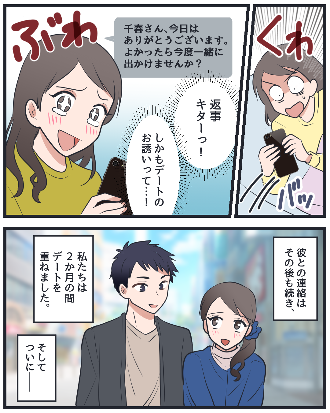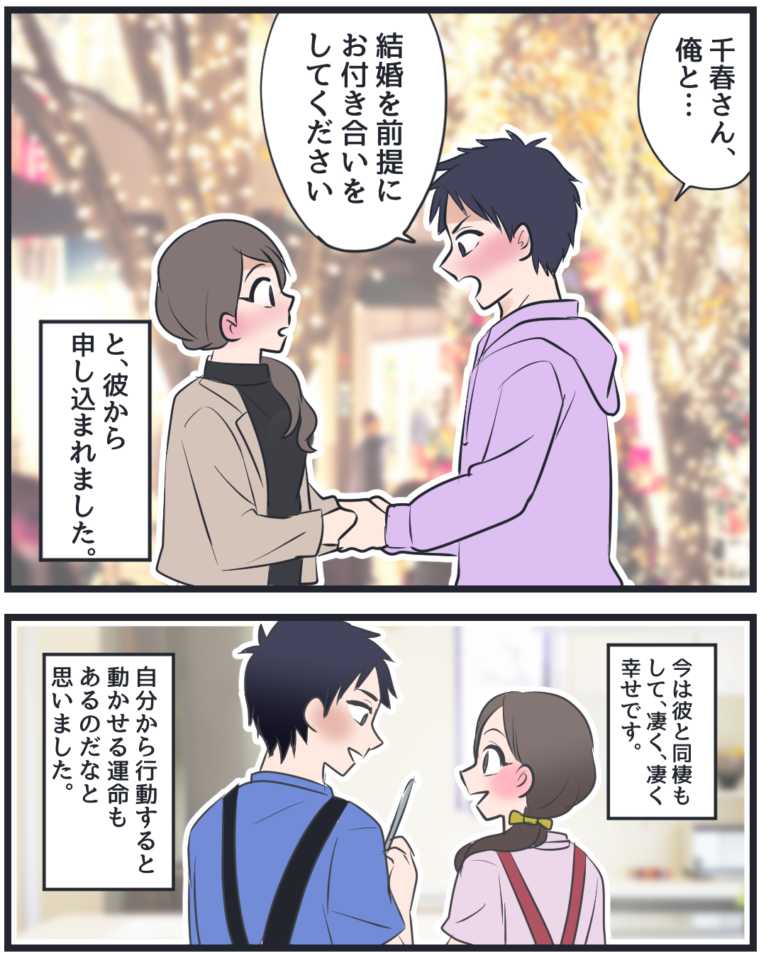 自分で動かした運命【Lovely漫画】 オリジナル漫画 2024年11月20日 目次 yuzunaさんの作品をもっと読む! yuzunaさんの作品一覧【Lovely漫画】 yuzunaさんの作品をおまとめしています! こちらのLovely漫画もおすすめ! 一瞬のチャンスを逃さなかった私【Lovely漫画】 友達と飲みに行った時の事。行きたいお店が休みで急遽いつもの居酒屋に変更。私たちが席に着いたすぐ後、入店してきたグループに…©julie/エピソード:さわ 未来の彼氏とバス停で。【Lovely漫画】 毎朝バス停で見かける彼に一目惚れした私。だけど、ある日突然会えなくなった。半年後、突如現れた男の子は、あの時の…?!©しろみ/エピソード:みぃ これは運命の出会いだ…【Lovely漫画】 海外に留学中、友人と食事をしていると現地の外国人3人に声を掛けられた。その中の1人が、顔も雰囲気もかなりタイプ!だけど連絡先を聞けずに解散…。そして翌日、出かけた先で遭遇したのは、なんと…。©みやまち/エピソード:るる バイトの先輩と【Lovely漫画】 一目惚れしたバイトの先輩にデートに誘われた!友達曰く「3回目までに告白されないとカップルになる確率が減る」。もう2回目だけど何もないぞ…©望月悠/エピソード:ももっち ライター Lovely編集部 編集部レポや最新情報など皆さんの「知りたい」をお届け!よろしくお願いします♡ Related article / 関連記事 オリジナル漫画 メンヘラ彼氏にサヨナラ【Lovely漫画】 ©みんみ 2022年3月29日 オリジナル漫画 年下イケメン彼氏に翻弄されるオンナの毎日#3【Lovely漫画】 ©みんみ 2022年3月29日 オリジナル漫画 2人暮らしのゆる家事日記~気まぐれ旦那の献立作りの巻き~後編【Lovely漫画】 ©みんみ 2022年3月29日 オリジナル漫画 年下イケメン彼氏に翻弄されるオンナの毎日#1【Lovely漫画】 ©みんみ「初めての○○の話 前編」 2022年3月29日 オリジナル漫画 年下イケメン彼氏に翻弄されるオンナの毎日#2【Lovely漫画】 ©みんみ「初めての○○の話 後編」 2022年3月29日 1 2 3 オリジナル漫画 よかったらシェアしてね! URLをコピーしました! URLをコピーしました! ヤベェ同期に困ってます!!69【稲漫画】 一目惚れから始まる恋愛の行方って?男性の一目惚はうまくいく?