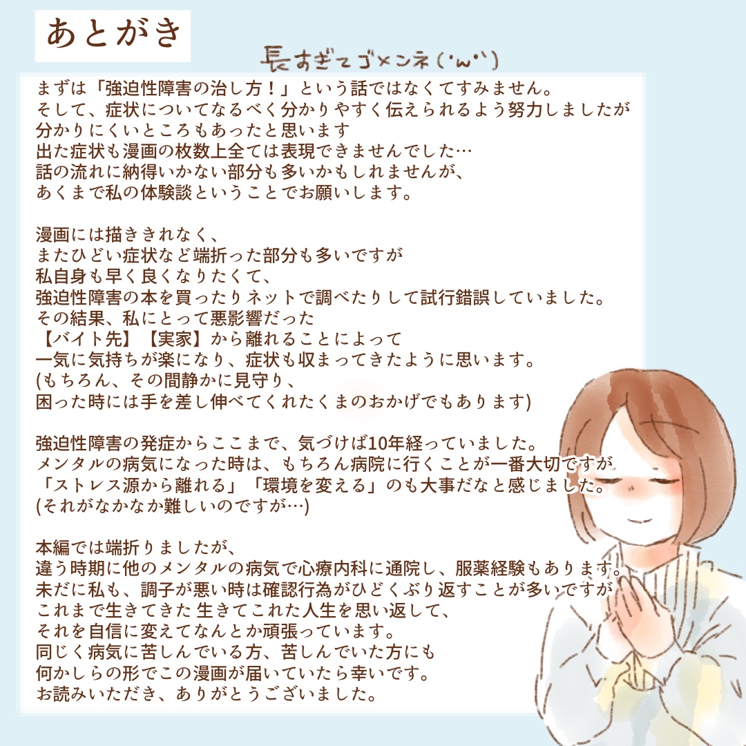 強迫性障害になった話17(完)【ゆめの漫画】 オリジナル漫画 2022年3月29日 目次 次を読む 強迫性障害になった話 おまけ【ゆめの漫画】 ゆめのさんが病気を体験し現在に至るまでのエッセイ漫画©ゆめの※暴力的な表現が登場します。苦手な方はご注意ください。 ゆめのさんの連載一覧はこちら 付き合って14年の同い年夫婦のエッセイ漫画 付き合って14年の同い年夫婦のエッセイ漫画©ゆめの こちらのLovely漫画もおすすめ ママ活男子の恋 1【みわ柴ちゃん漫画】 ママ活で出会った1人の女性に心を奪われていく、男子大学生のラブストーリー。(※このストーリーはフィクションです。) ©みわ柴ちゃん かままの(第一子)妊娠記録 1【かまま漫画】 おなかに娘がやってきたときのはなし ©かまま ライター ゆめの 付き合ってから14年、くま=夫・ゆめの=妻の同い年夫婦です!Instagram【@yumeno_bear】 Related article / 関連記事 オリジナル漫画 メンヘラ彼氏にサヨナラ【Lovely漫画】 ©みんみ 2022年3月29日 オリジナル漫画 年下イケメン彼氏に翻弄されるオンナの毎日#3【Lovely漫画】 ©みんみ 2022年3月29日 オリジナル漫画 2人暮らしのゆる家事日記~気まぐれ旦那の献立作りの巻き~後編【Lovely漫画】 ©みんみ 2022年3月29日 オリジナル漫画 年下イケメン彼氏に翻弄されるオンナの毎日#1【Lovely漫画】 ©みんみ「初めての○○の話 前編」 2022年3月29日 オリジナル漫画 年下イケメン彼氏に翻弄されるオンナの毎日#2【Lovely漫画】 ©みんみ「初めての○○の話 後編」 2022年3月29日 1 2 オリジナル漫画 よかったらシェアしてね! URLをコピーしました! URLをコピーしました! 好きだから離れると決心する片思い中の人の理由や心理とは? 【先読み】ふたりのなれそめ 9【まつり漫画】